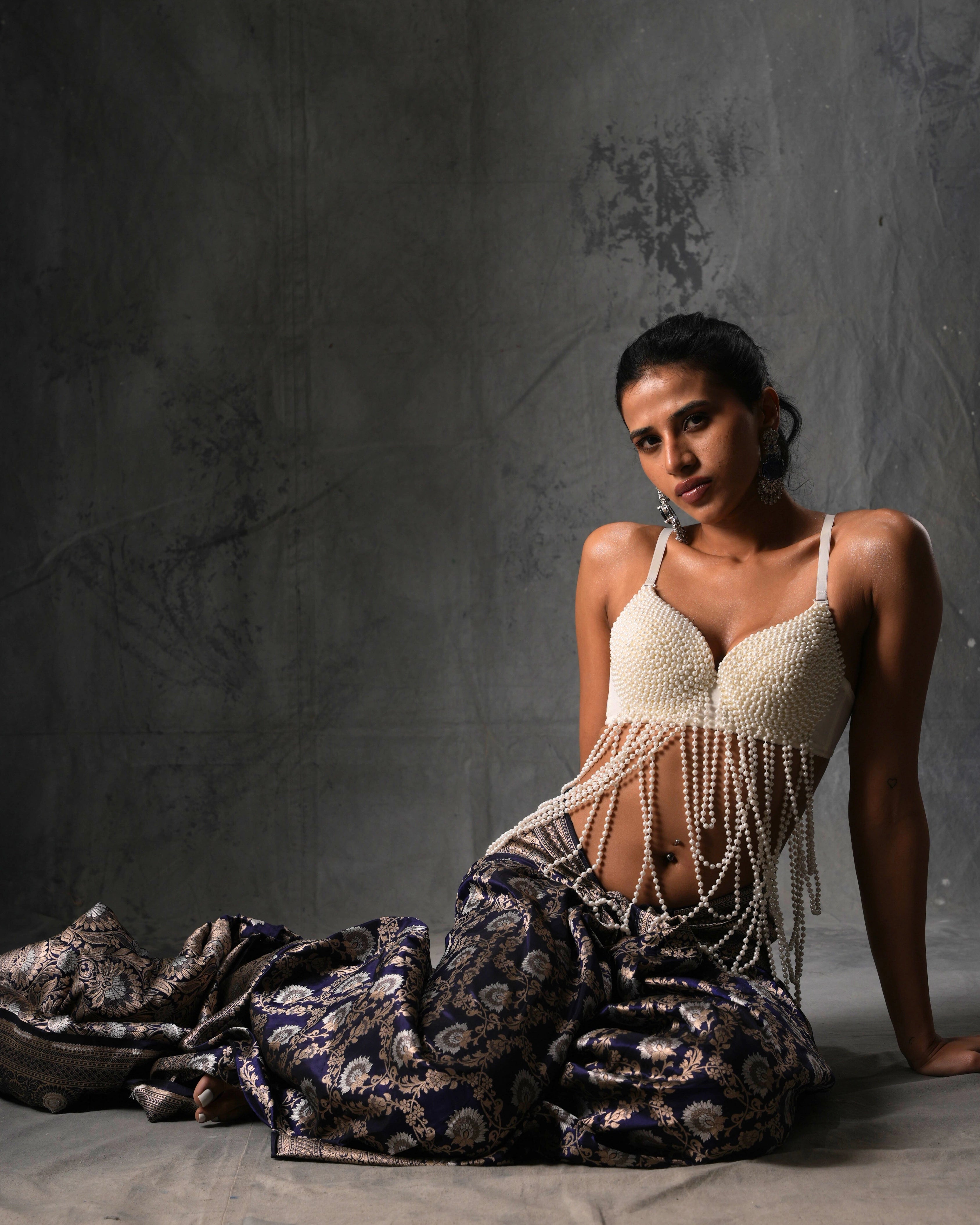 Black Georgette Drape Saree with Gold Banarasi Silk and Silk Hand Embroidered Blouse