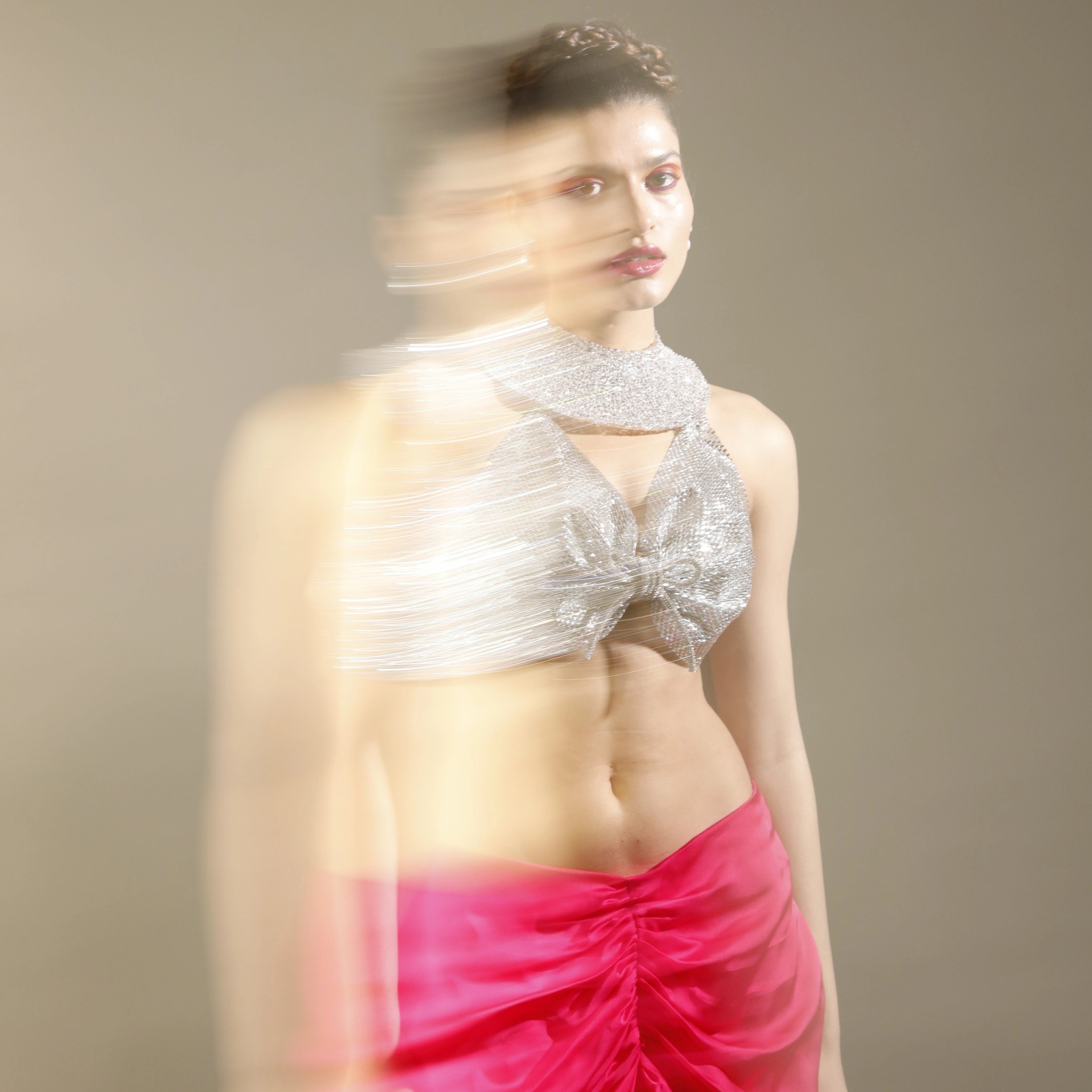 Pink Fuchsia Draped Silk Skirt with Silver Crystal-Embellished Halter Butterfly Blouse