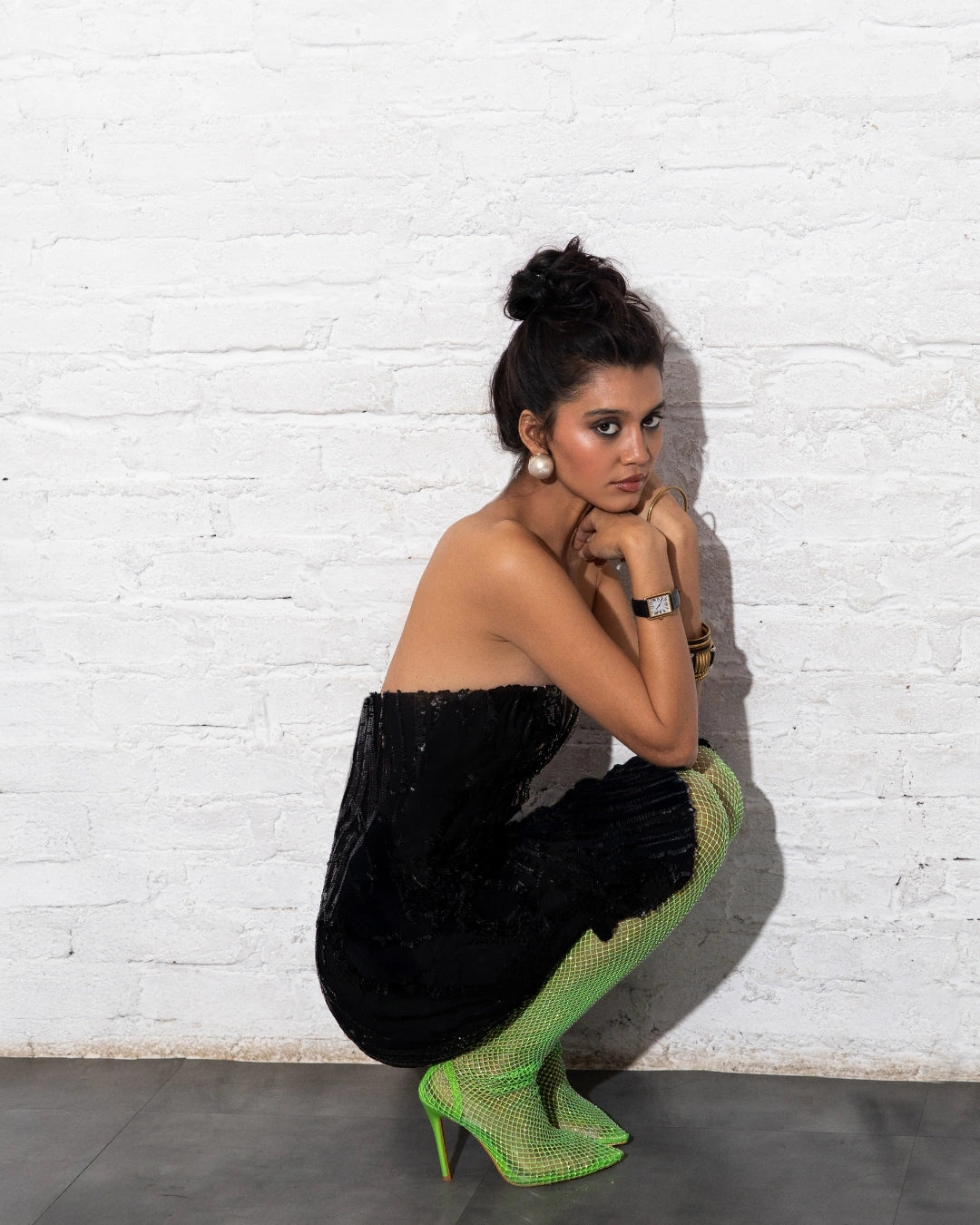 Crafted with a black base, it features fluid, wave-like embellishments in black tones that shimmer with every movement. Finished with a clean bandeau neckline, this piece balances bold artistry with timeless sophistication an elevated statement for evenings that demand presence, polish, and undeniable allure.