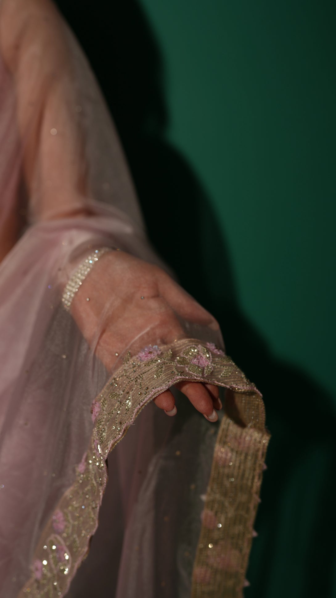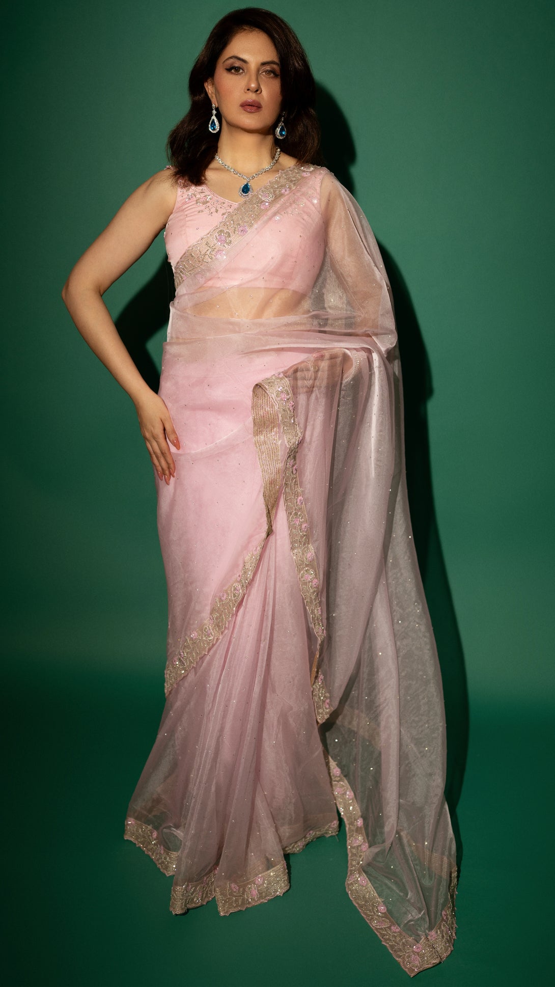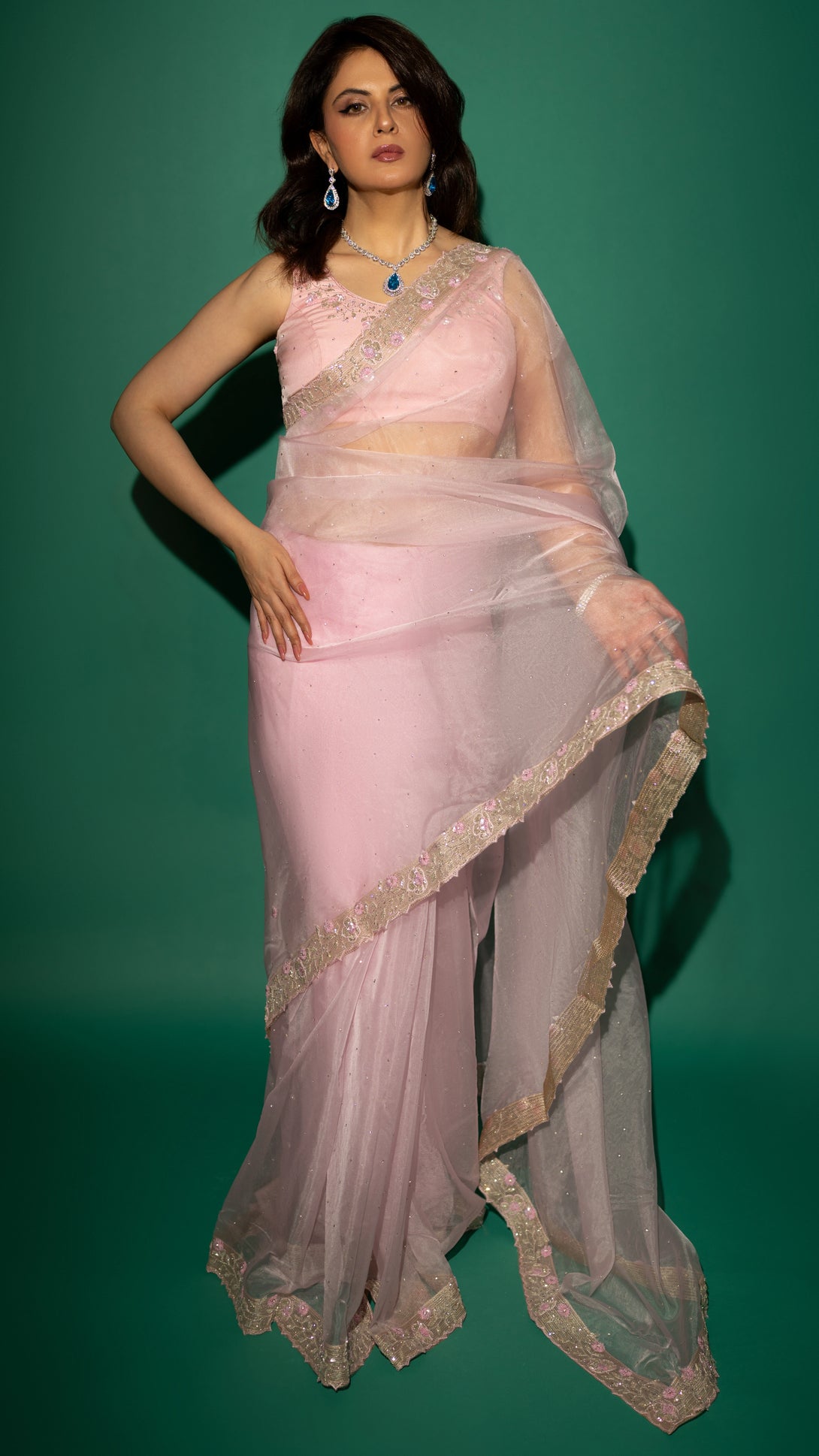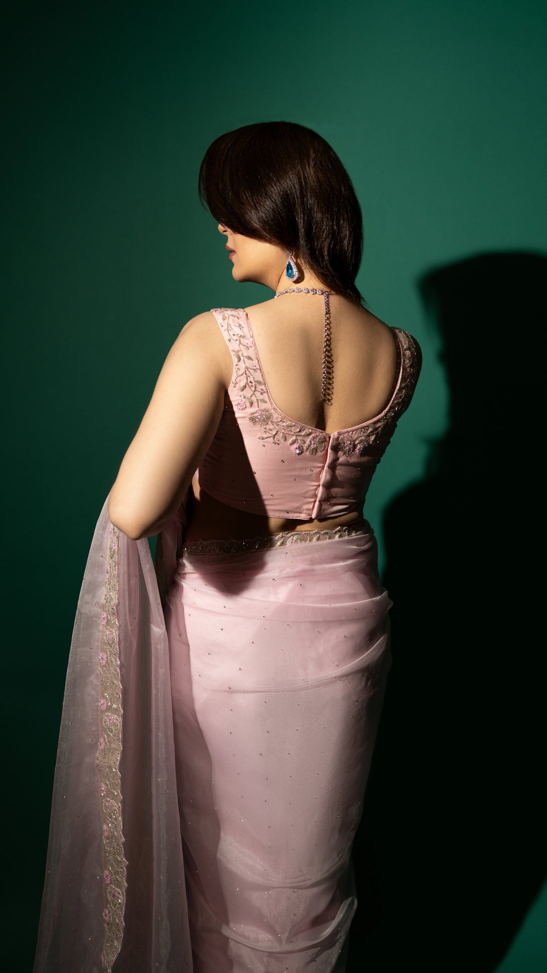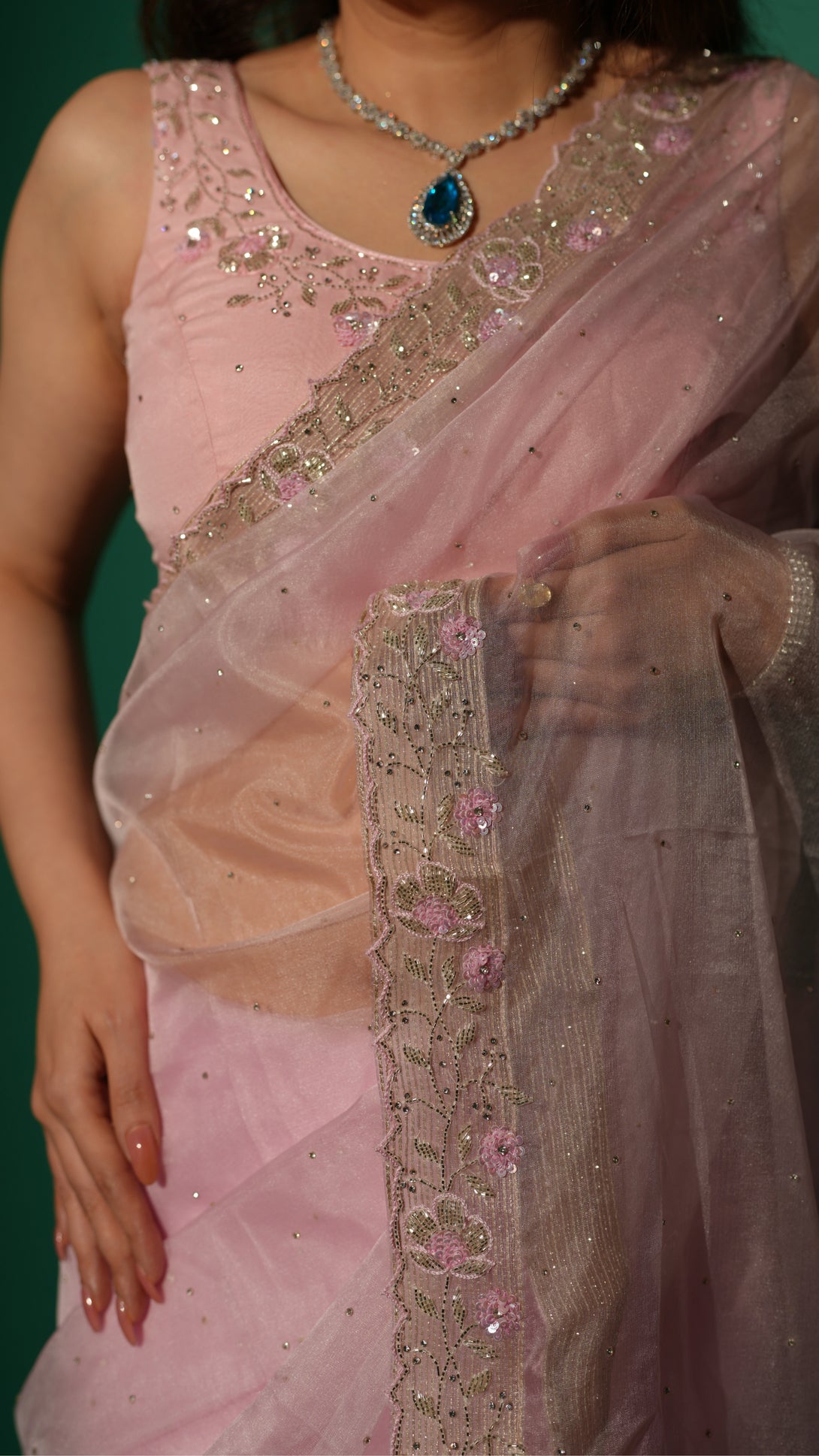 Baby Pink Hand Embroidered Saree and Matching Floral Embroidered Blouse