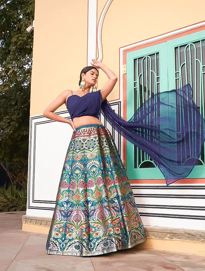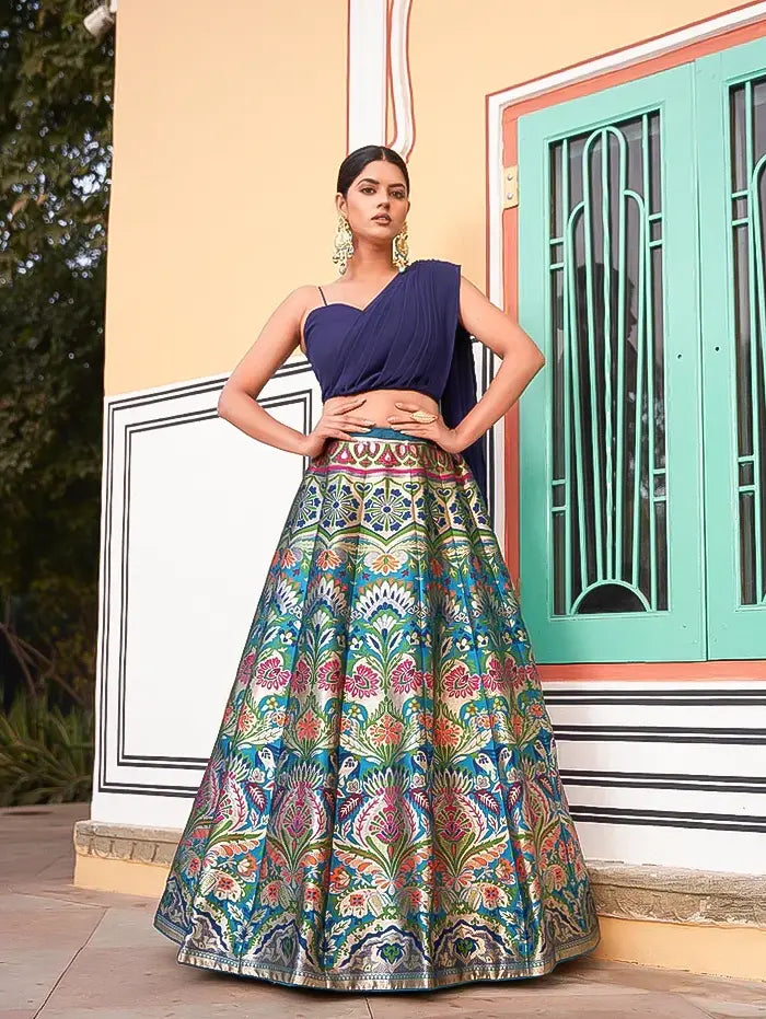 This "Blue Banarasi" silk lehenga is adorned with intricate brocade patterns featuring vibrant floral and geometric designs. Paired with a soft blue net dupatta, it balances timeless tradition with modern elegance, making it a perfect statement piece.