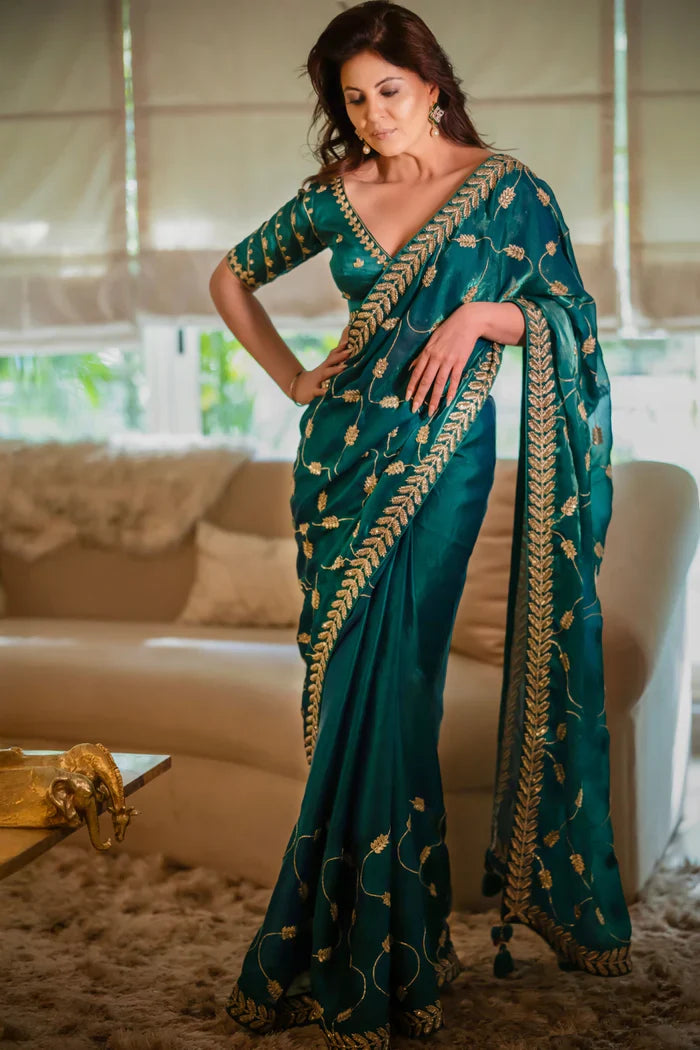 This saree features a emerald green organza silk base, adorned with golden leaf thread and zari leaf motifs, gracefully scattered across the drape. The intricately embroidered golden border adds depth and richness, making it a timeless piece for celebrations and special occasions.