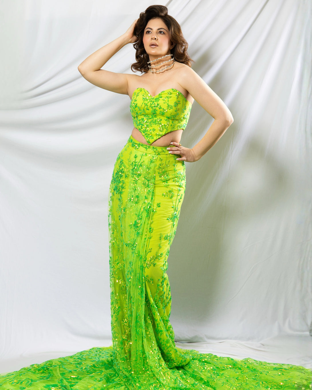 Introducing the Fluorescent Green Sheza Pre-Draped Saree Co-ord Set by Label Nonita a dazzling Indo-Western creation where modern structure meets traditional soul. Sculpted in vibrant fluorescent green. Handcrafted with intricate khaddi embroidery in self-tone threads and embellished with glistening stones, the corset-style top and pleated A-line skirt blend couture charm. This set can be styled as a striking co-ord or transformed into a pre-draped saree with a matching pallu upon request