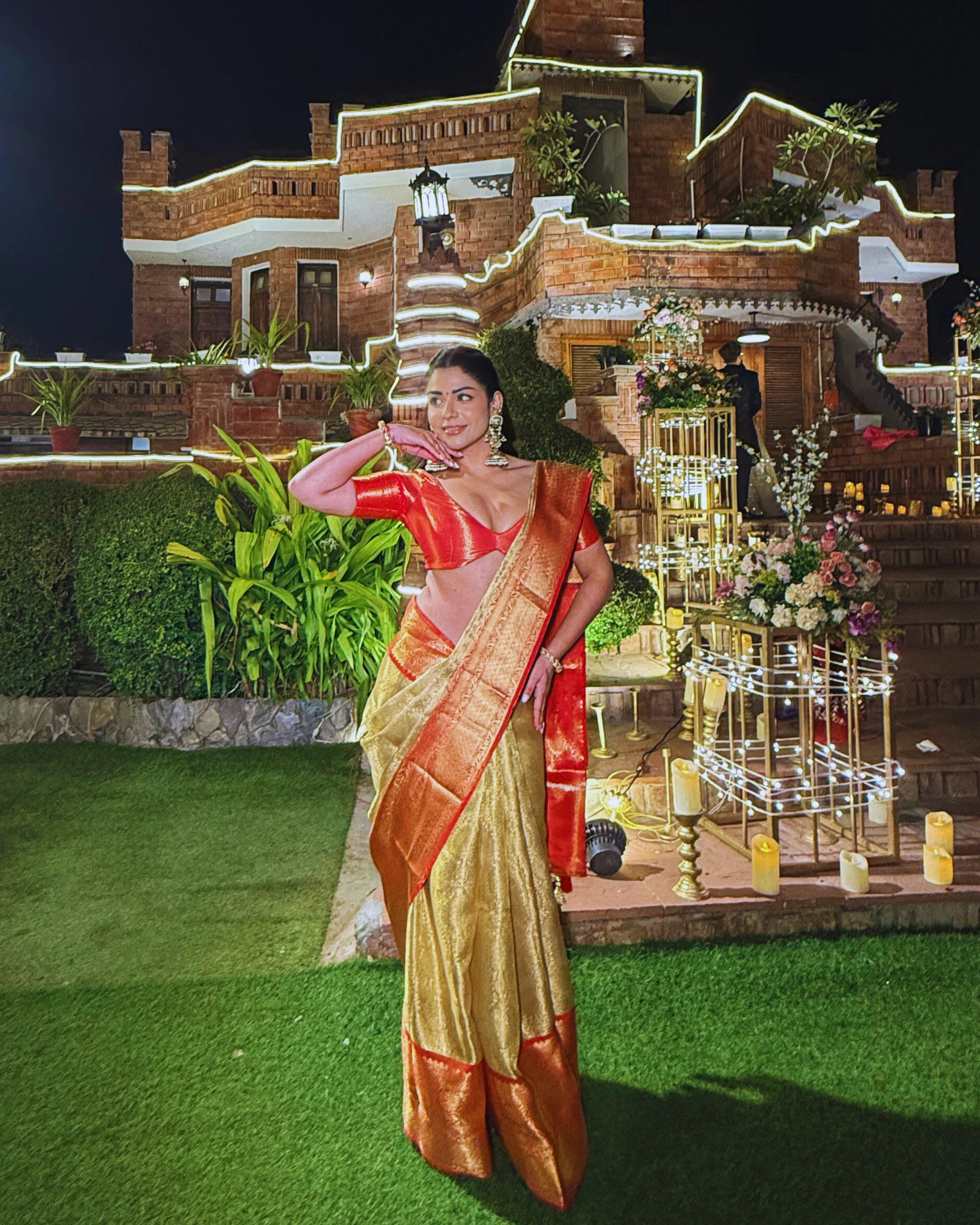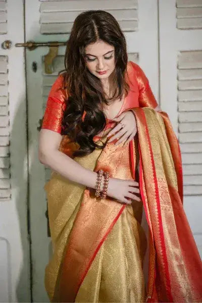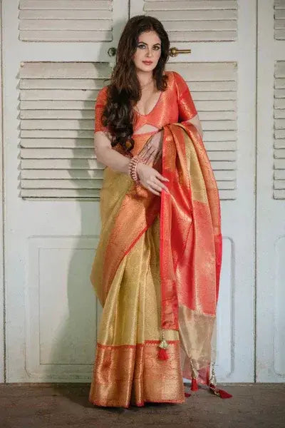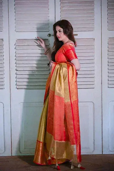 Gold Pure Banarasi Silk Saree with Orange Zari Border and Contrast Orange Blouse