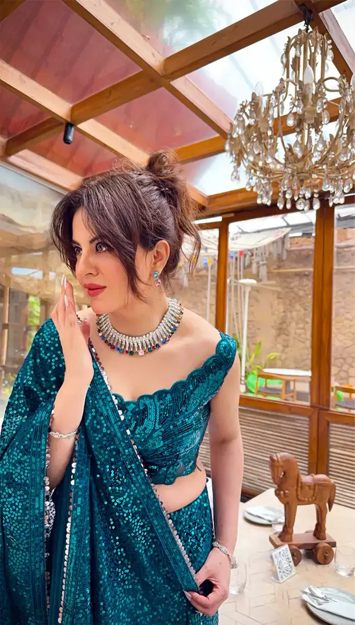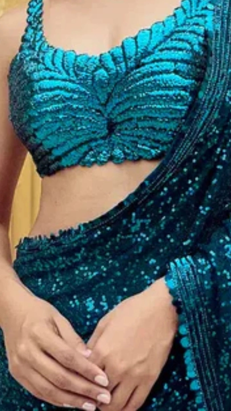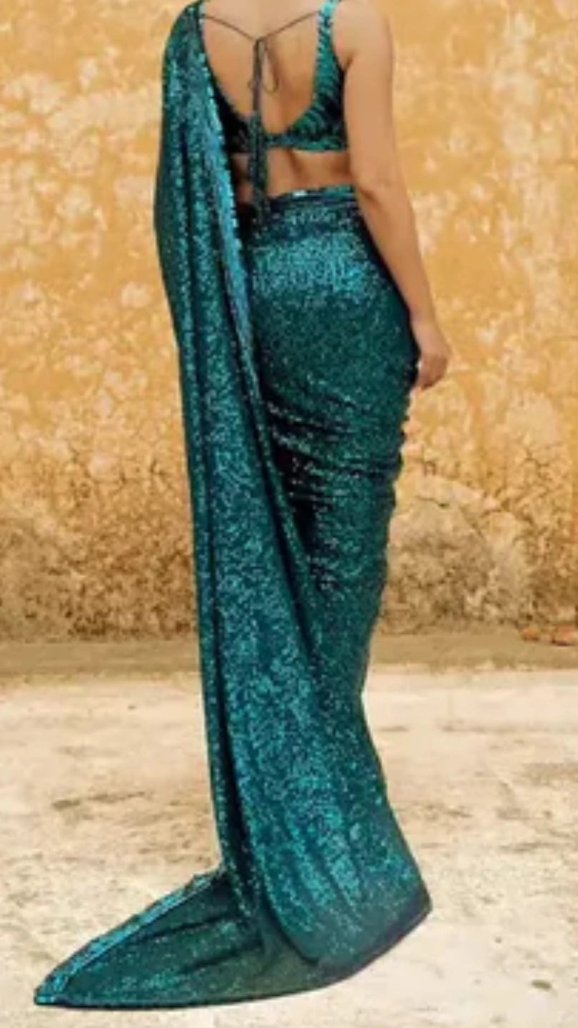 Green Sequin Georgette Saree with Hand Embroidery is where bold glamour meets artisanal finesse. The fluid georgette fabric drapes like a dream, while shimmering all-over sequin work and hand embroidery make every movement radiant.