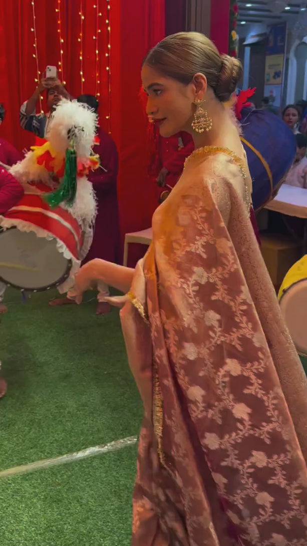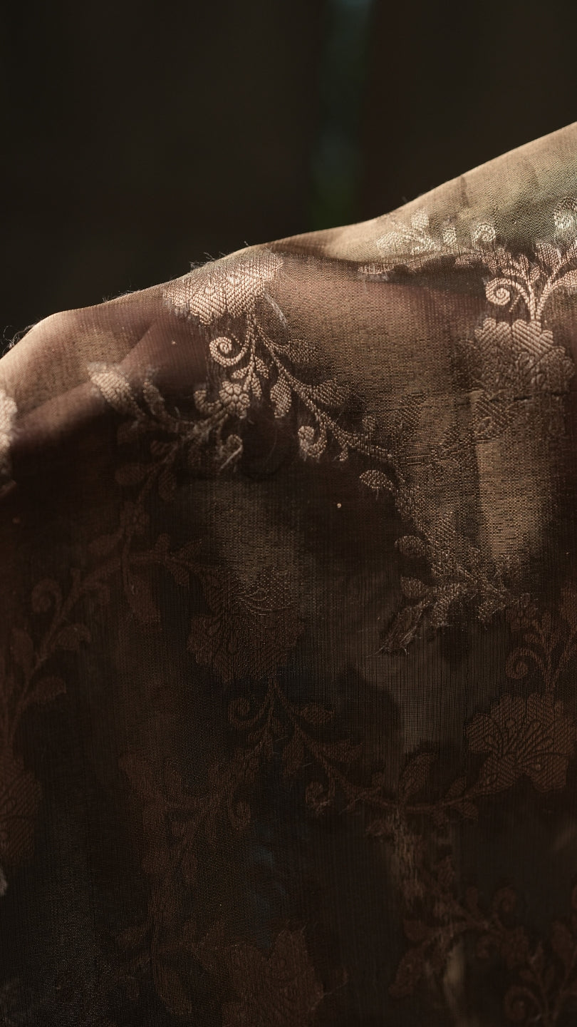 This "Varanasi Veil" Grey Banarasi Silk Saree with Pure Gold Zari Floral Weaving and Matching Checked Blouse is an ode to understated royalty. Its lustrous grey pure banarasi silk fabric, paired with intricate 2g gold zari work and all over floral design, pairs seamlessly with the matching checked design blouse piece. A drape that transcends trends, rooted deeply in heritage.