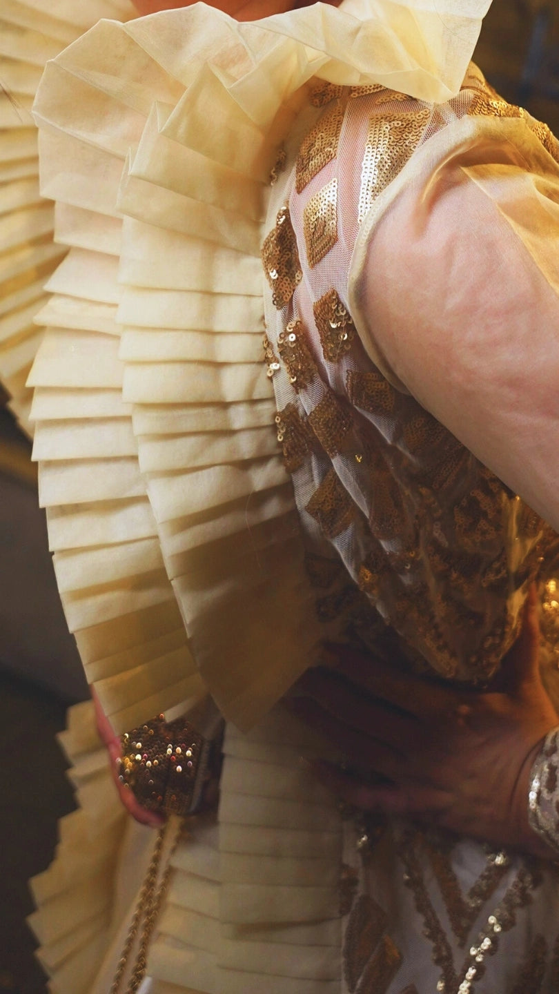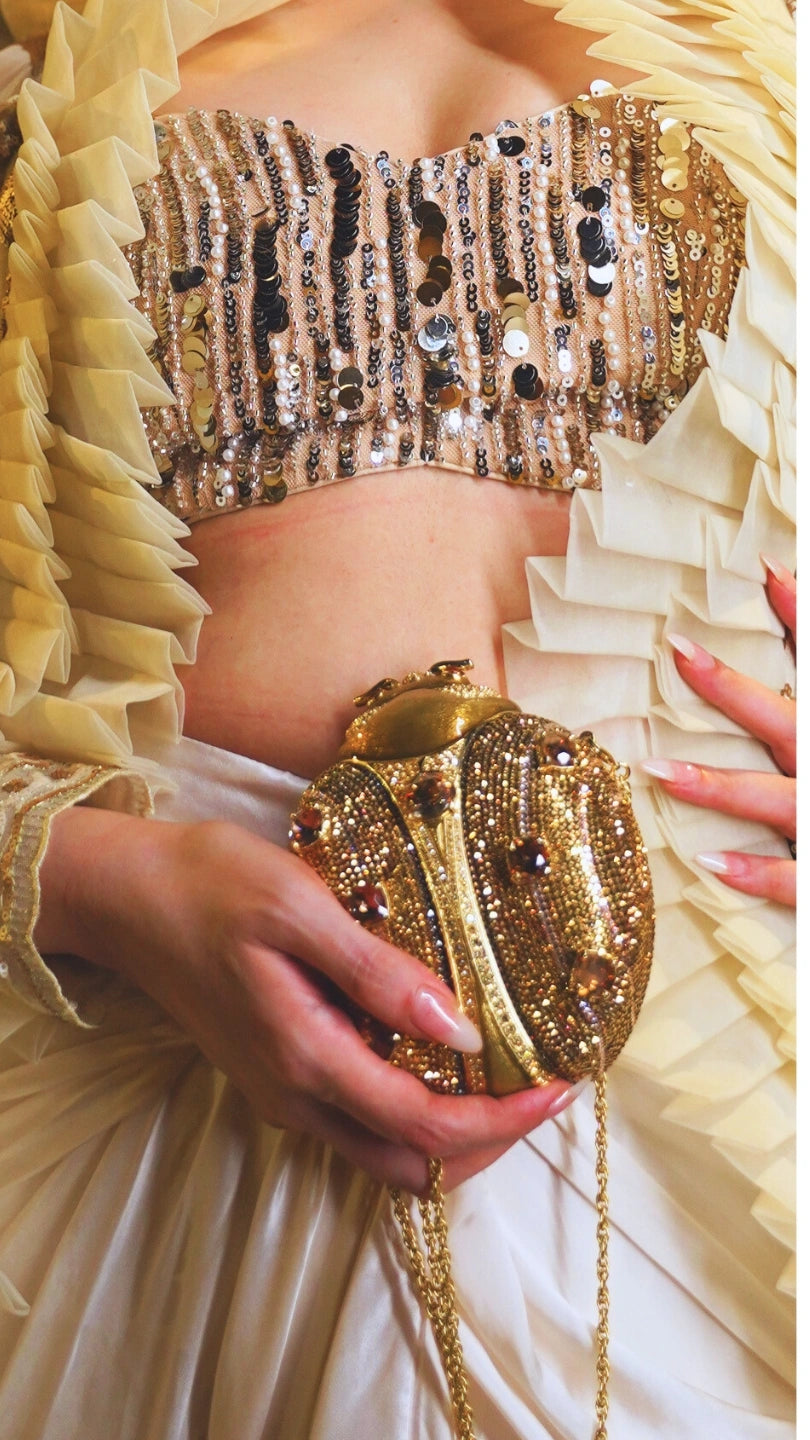 Work: Precision hand-pleated panels, all-over sequin embroidery, and detailed thread embellishments