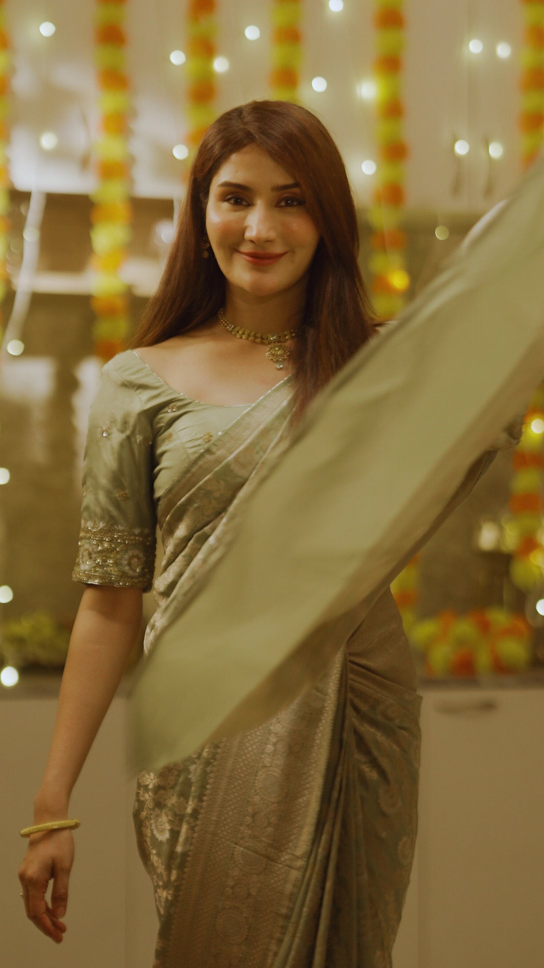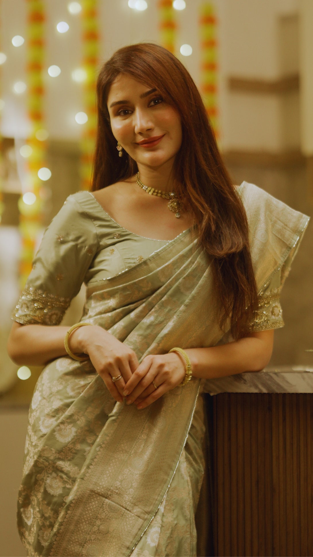Step into timeless elegance with our "Ananda Mattalic" Light Green Pure Banarasi Silk Saree, Woven with luxurious pure silk fabric, it features a distinctive floral weave, a heavy zari pallu, and an opulent broad border — all crafted in traditional Banarasi artistry. Perfectly suited for wedding guests, bridesmaids, mothers of the bride, or for those seeking the grace of pure heritage silk.