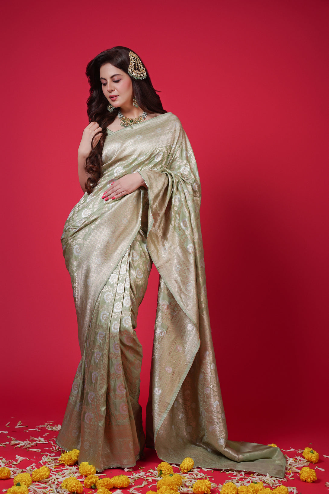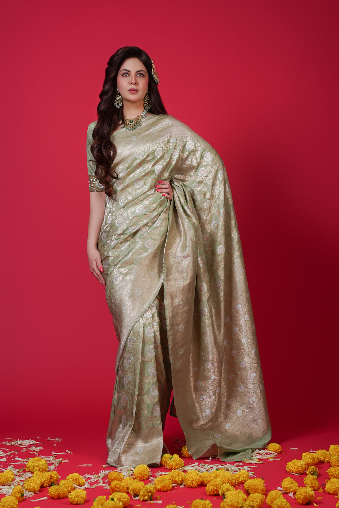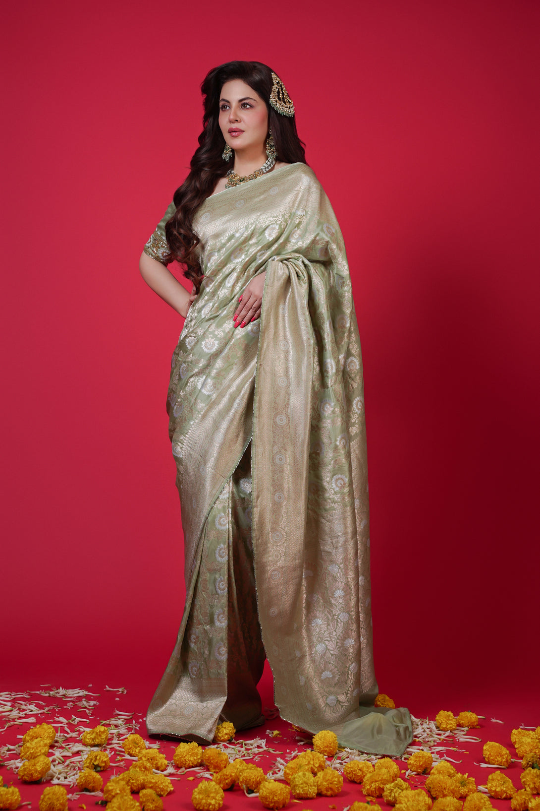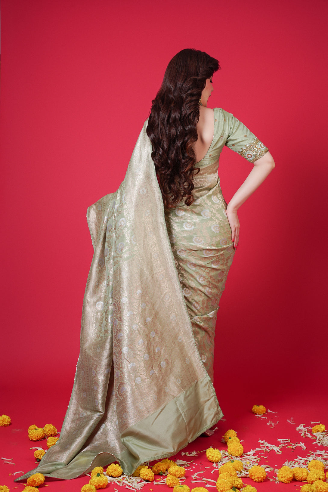 Light Green Pure Banarasi Silk Saree with Gold Floral Design and Matching Blouse.
