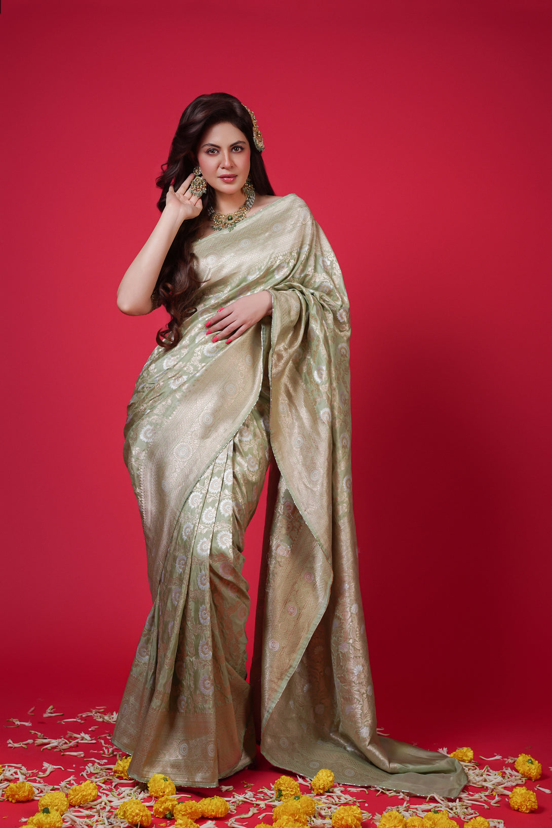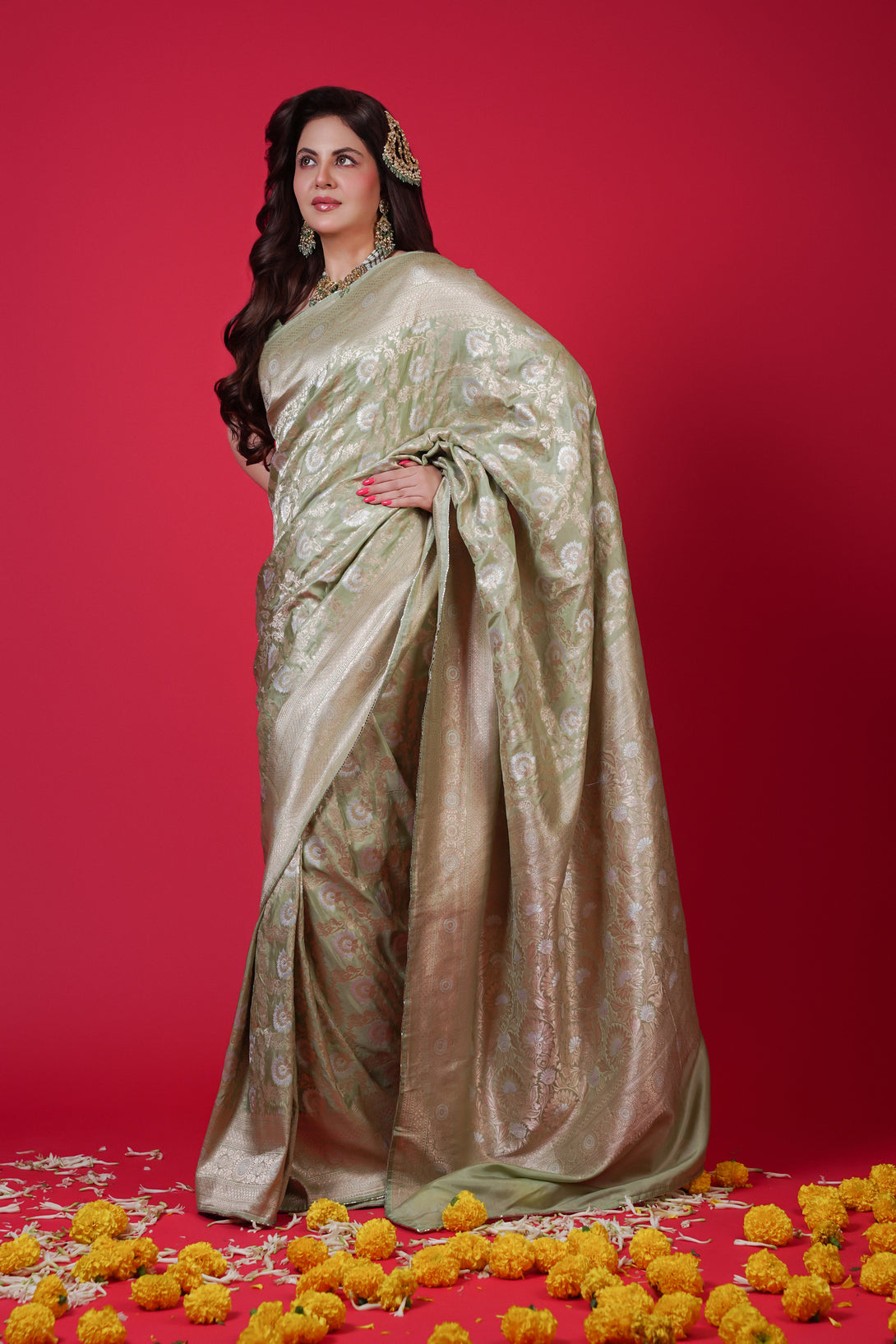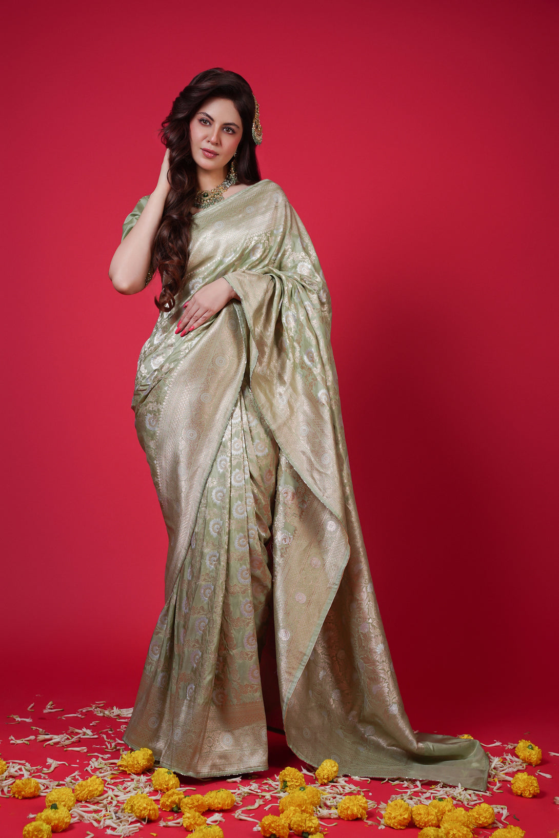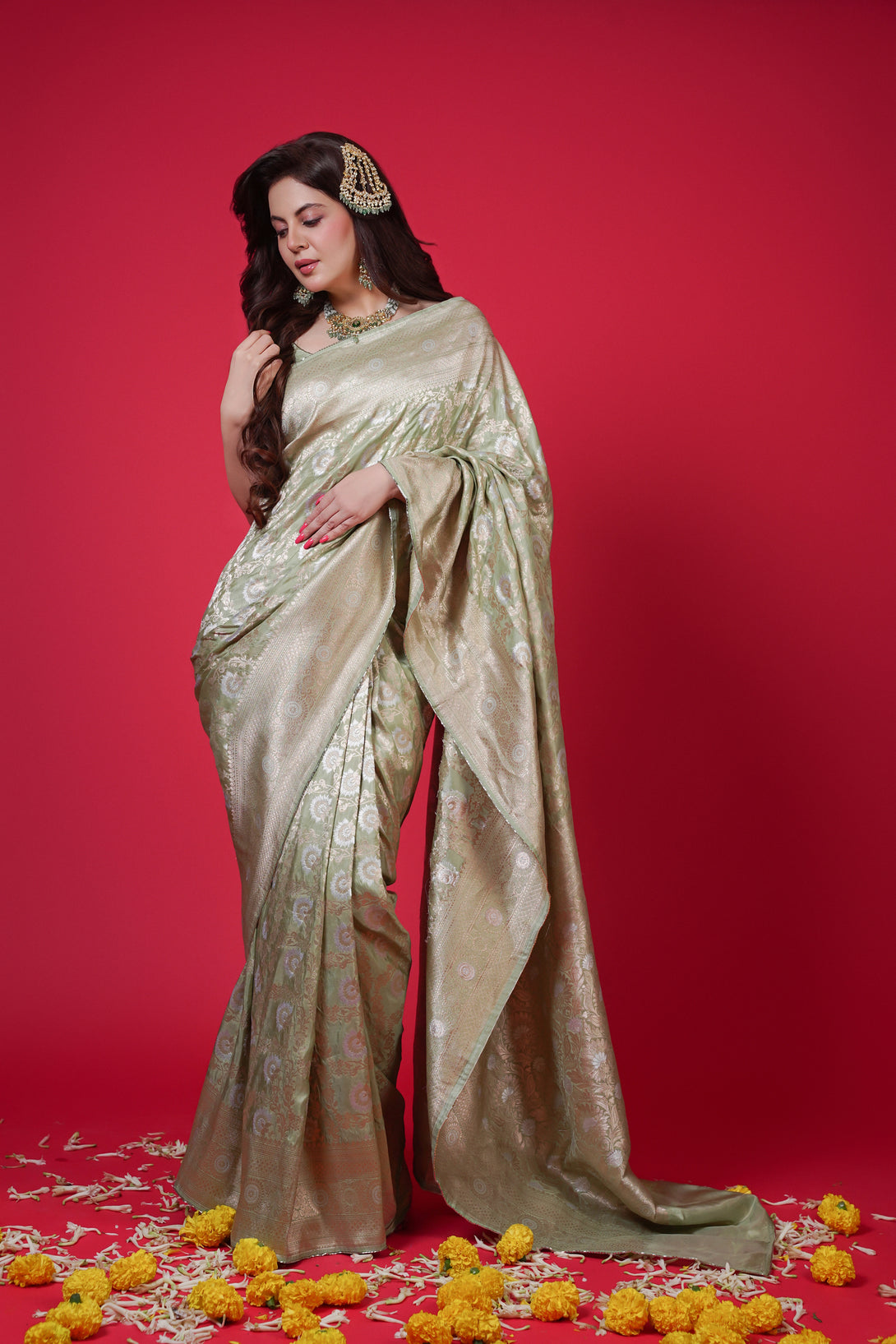 Light Green Pure Banarasi Silk Saree with Gold Floral Design and Matching Blouse.