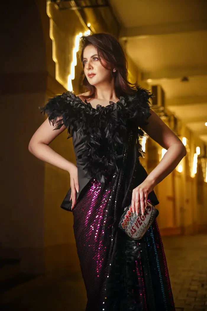 Label Nonita Fashion presents “Midnight Siren”, a powerfully elegant saree that fuses Bollywood drama with global runway edge. Crafted in dazzling black sequins with subtle strokes of magenta and blue, it captures light from every angle — like a star on the move. The show-stealing blouse, adorned with soft feathered ruffles and sharp tailoring, adds fierce femininity to this unforgettable ensemble.
