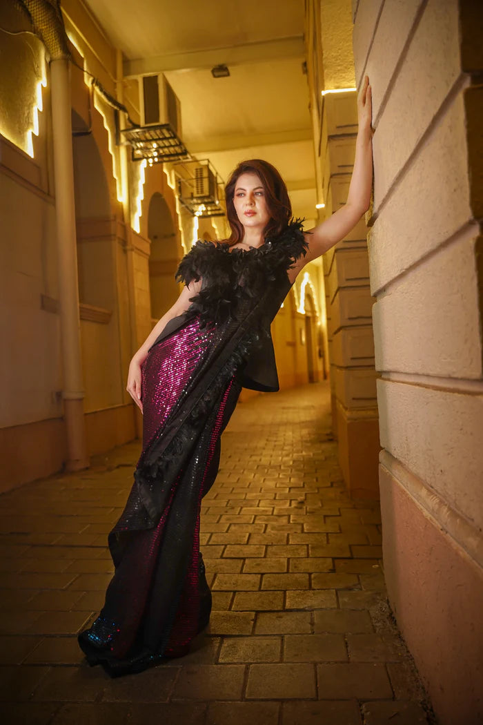 Midnight Siren – Black Sequin Saree with Ruffle Feather Blouse by Label Nonita Fashion