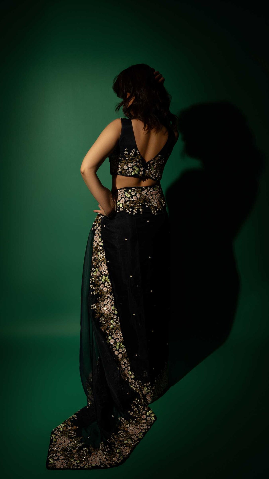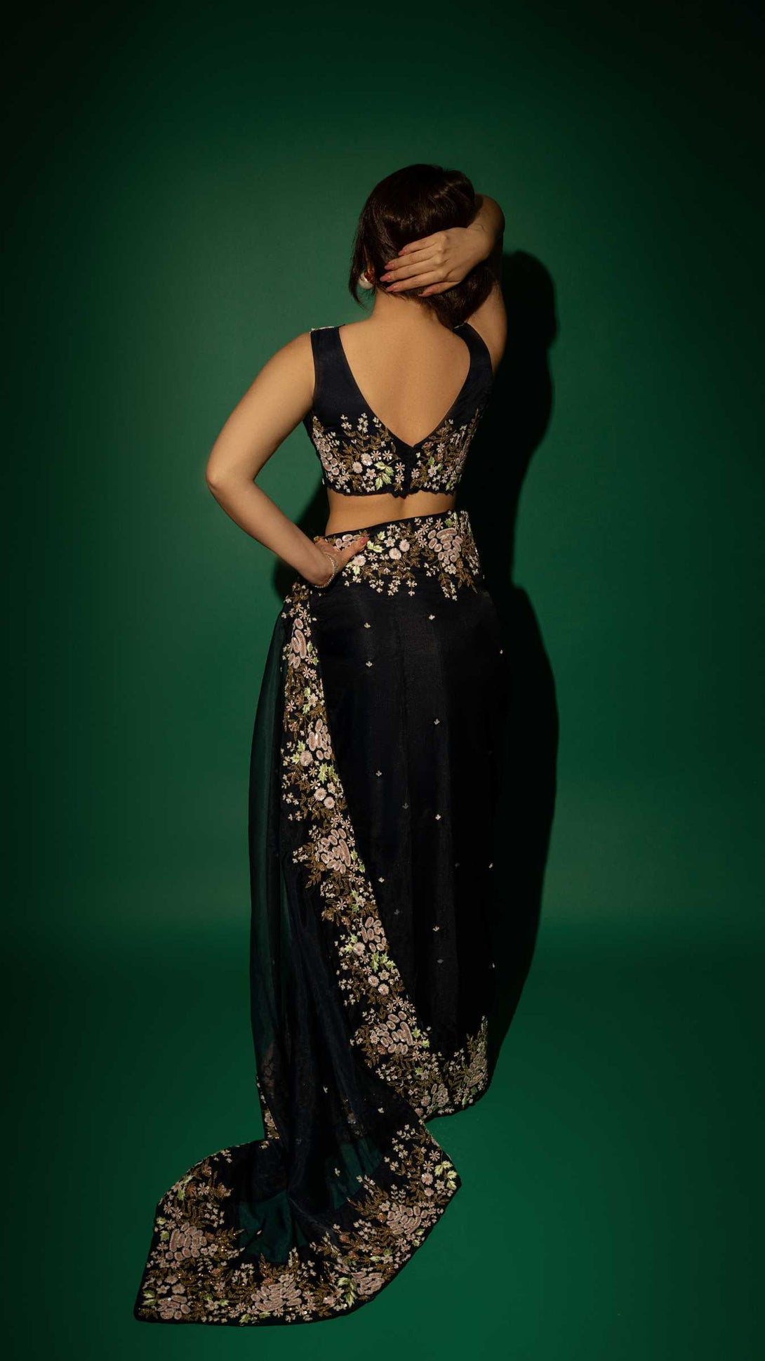 Navy Blue Silk Organza Zardozi Sequins Saree with Bead Handwork and Matching Floral Blouse