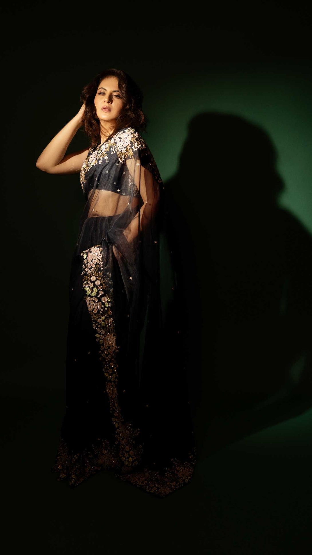 This "Shape of Lily Saree " is Crafted from luxurious silk organza. Beautifully adorned with sequins, delicate thread work, fine bead embellishments, and intricate Zardozi detailing, this saree embodies timeless artistry. The refined self-border finishing on the inside adds a graceful and understated elegance to every drape.