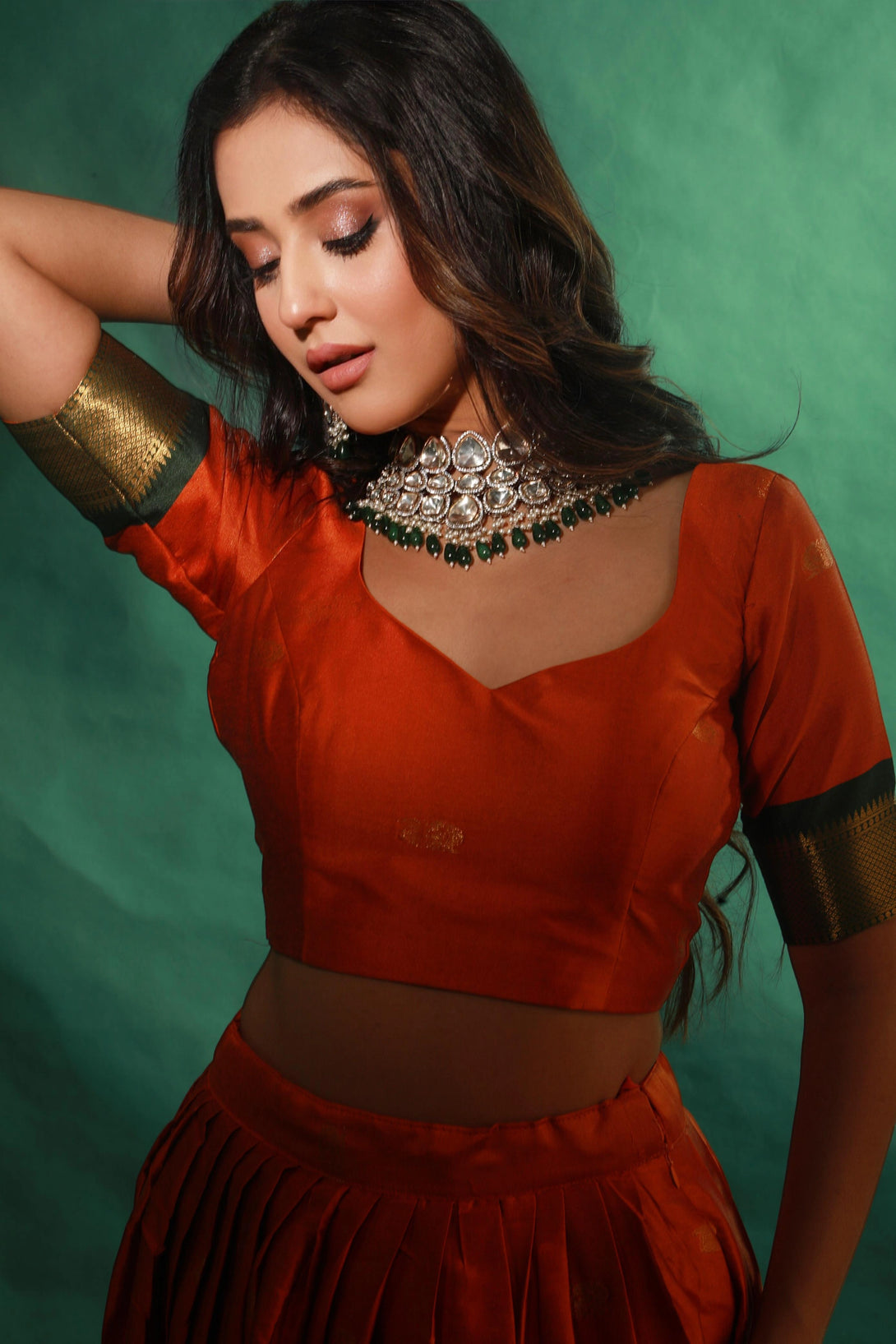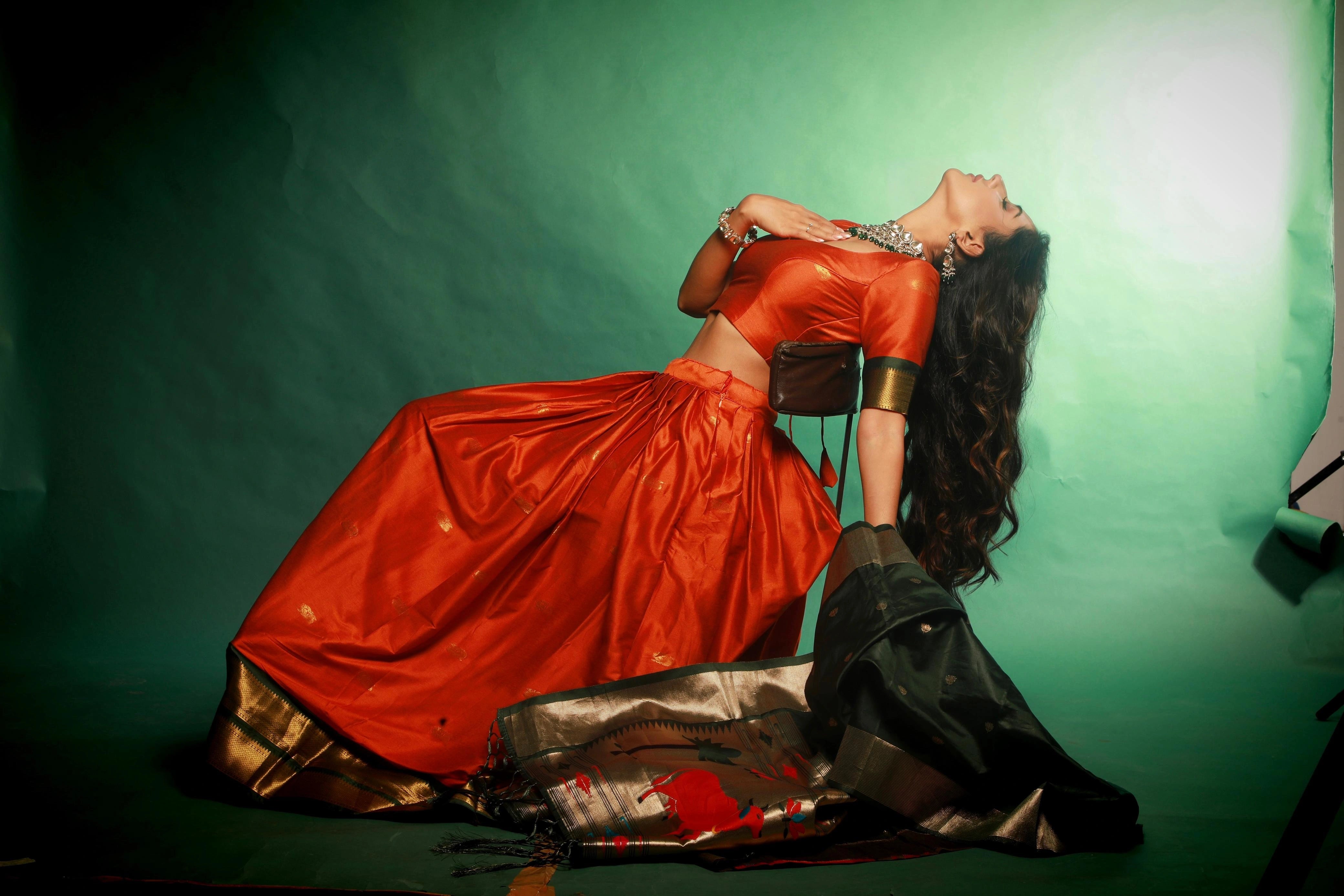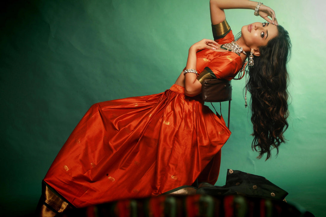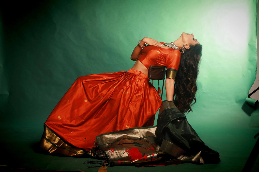 Orange Silk Lehenga with Green Paithani Dupatta and Gold Border Detailing