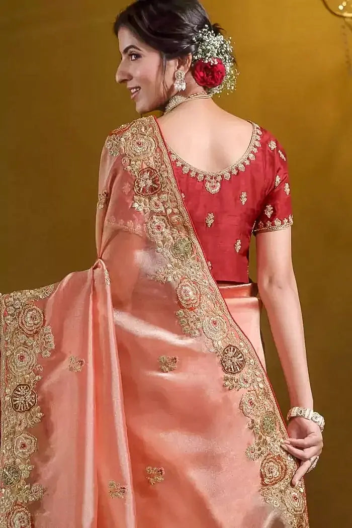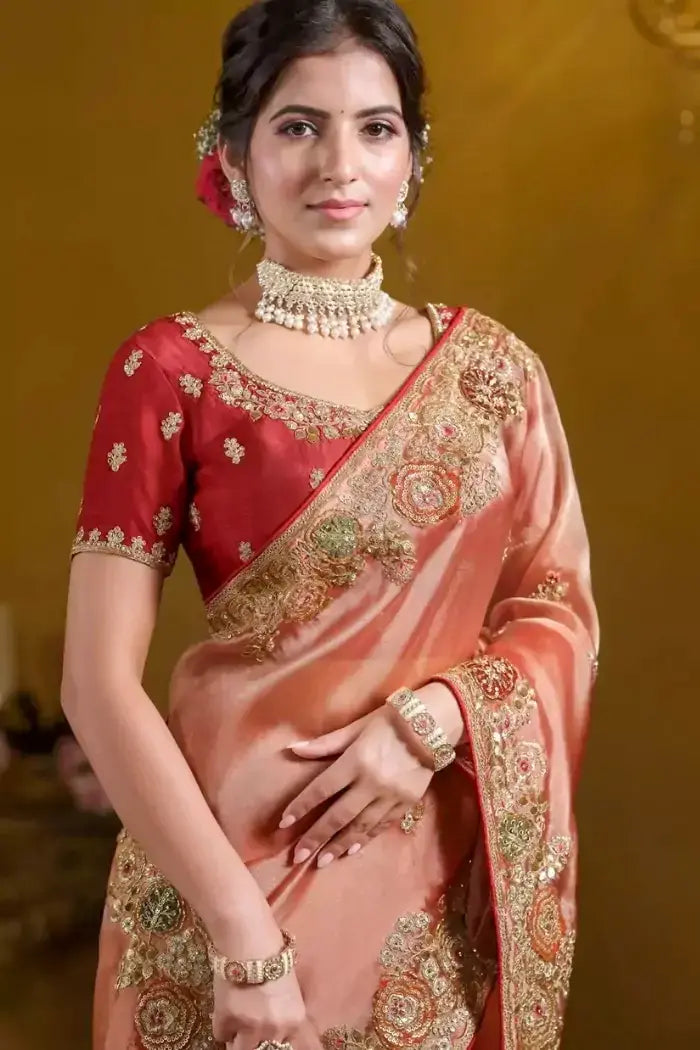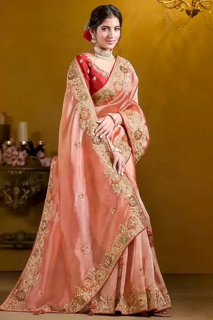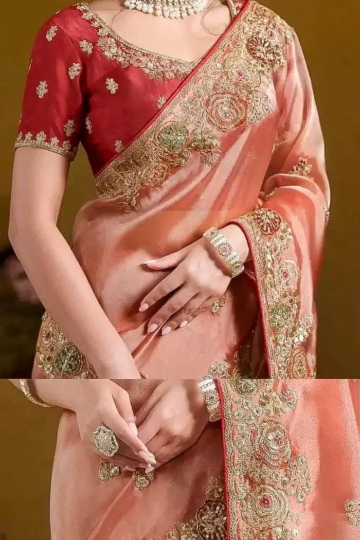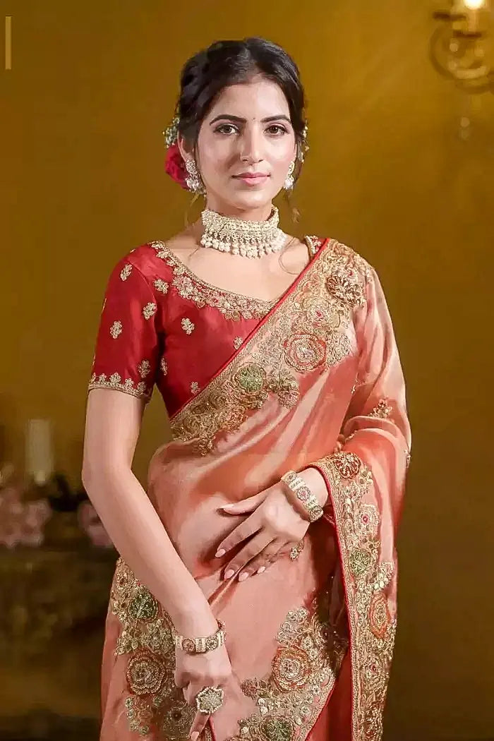 Orange Silk Saree with Embroidery Pallu Borders Design and Matching Embroidery Blouse A perfect blend of festive radiance and regal finesse, this saree is designed to make every drape a statement of elegance and charm.