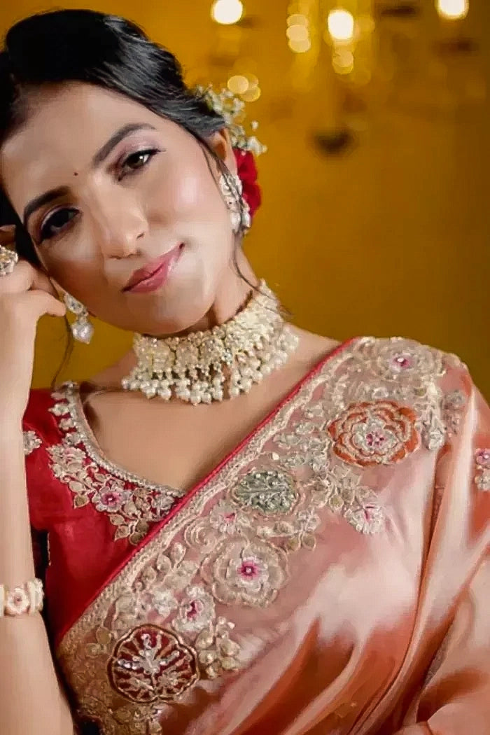 This saree captures the essence of tradition with its rich orange silk base, highlighted by intricate golden embroidery along the borders and pallu. The luminous embroidery glows beautifully against the vibrant silk, making it an ideal choice for weddings and festive celebrations.