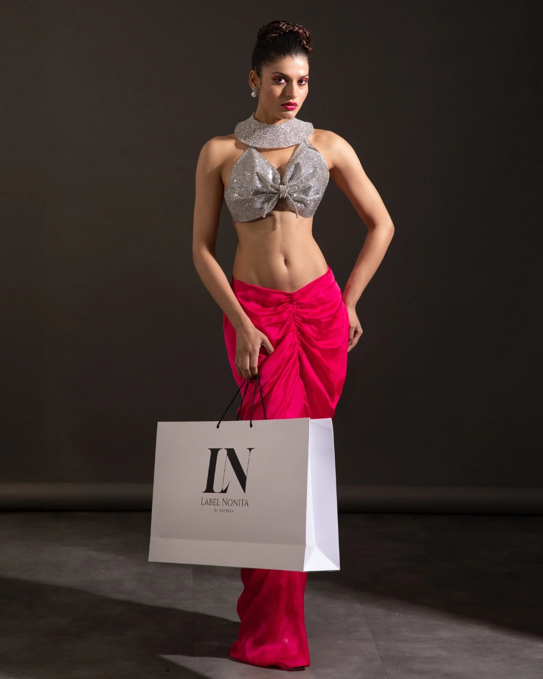 The silver crystal-embellished halter butterfly blouse features a sculpted neckline and intricate shimmer detailing. Paired with a pink fuchsia silk skirt, artfully draped to enhance movement and form, the look balances fluid sensuality with structured sophistication. Crafted for fashion-forward evenings, editorial moments, and international style statements where impact is everything.