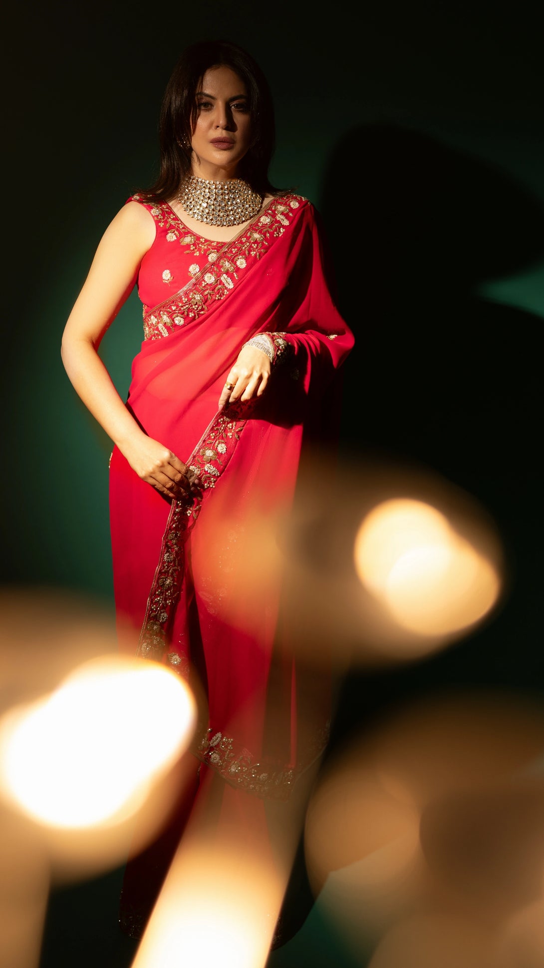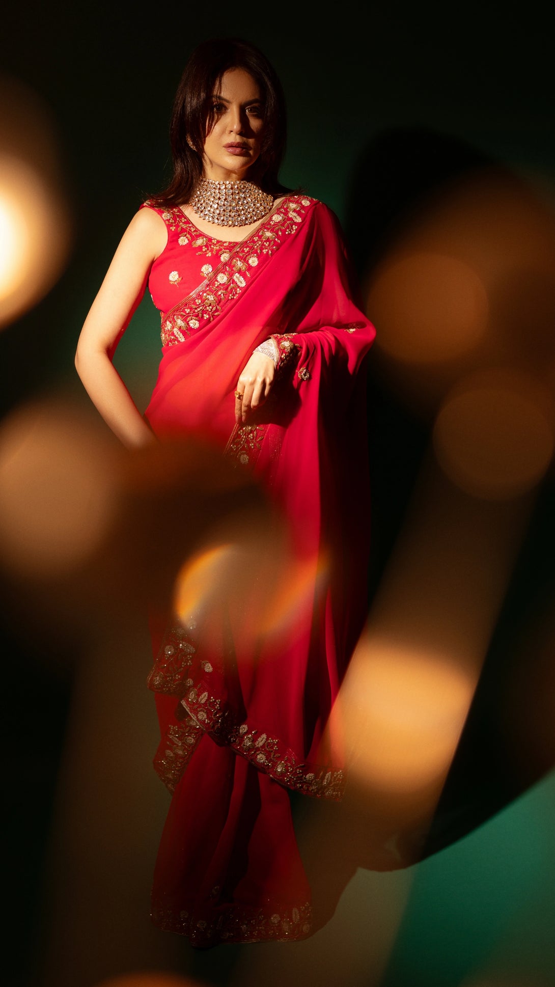 This "Fleur-de-Lis Saree" is Crafted from premium lightweight georgette. The Sadi handwork combined with delicate floral thread embroidery and sequins detailing adds depth and brilliance to every drape. Beautifully finished with a refined champagne border on the inside.