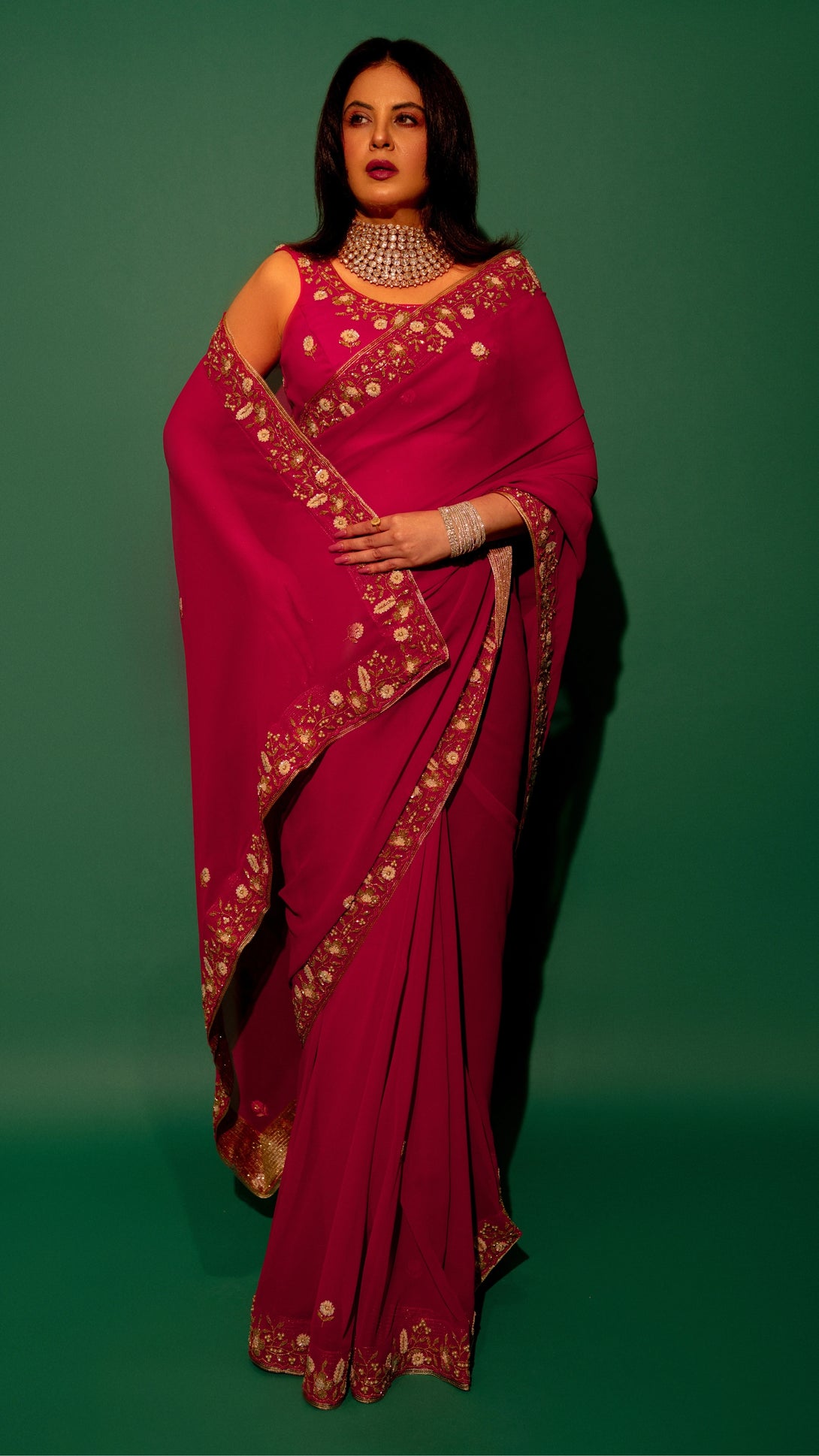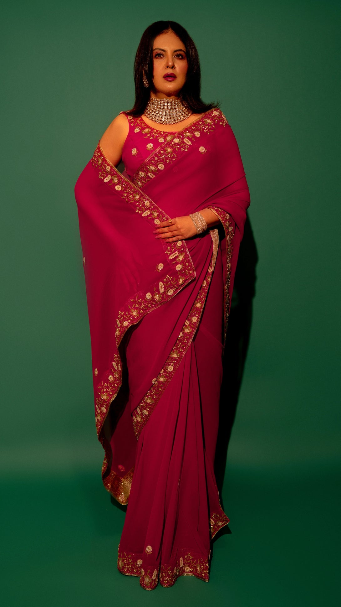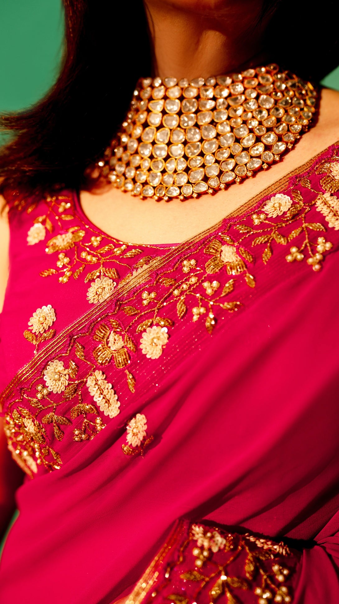 Pink Hand Embroidered Georgette Saree and Matching Floral Embroidered Blouse