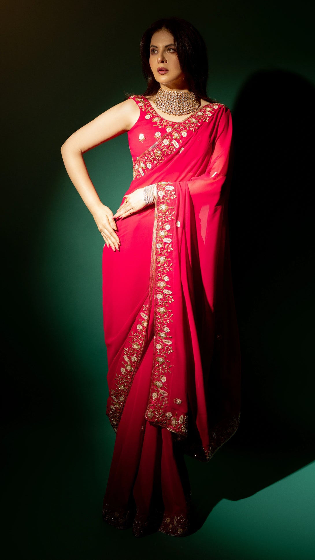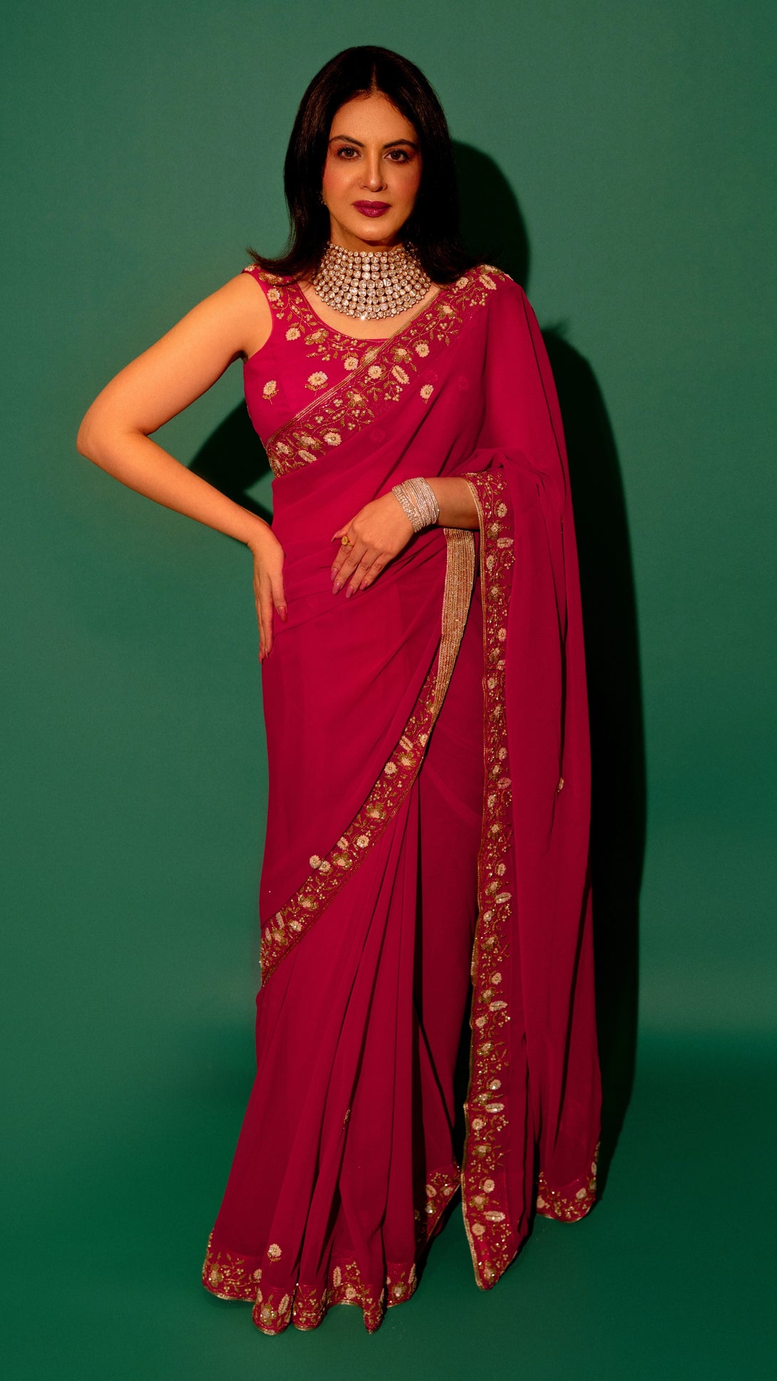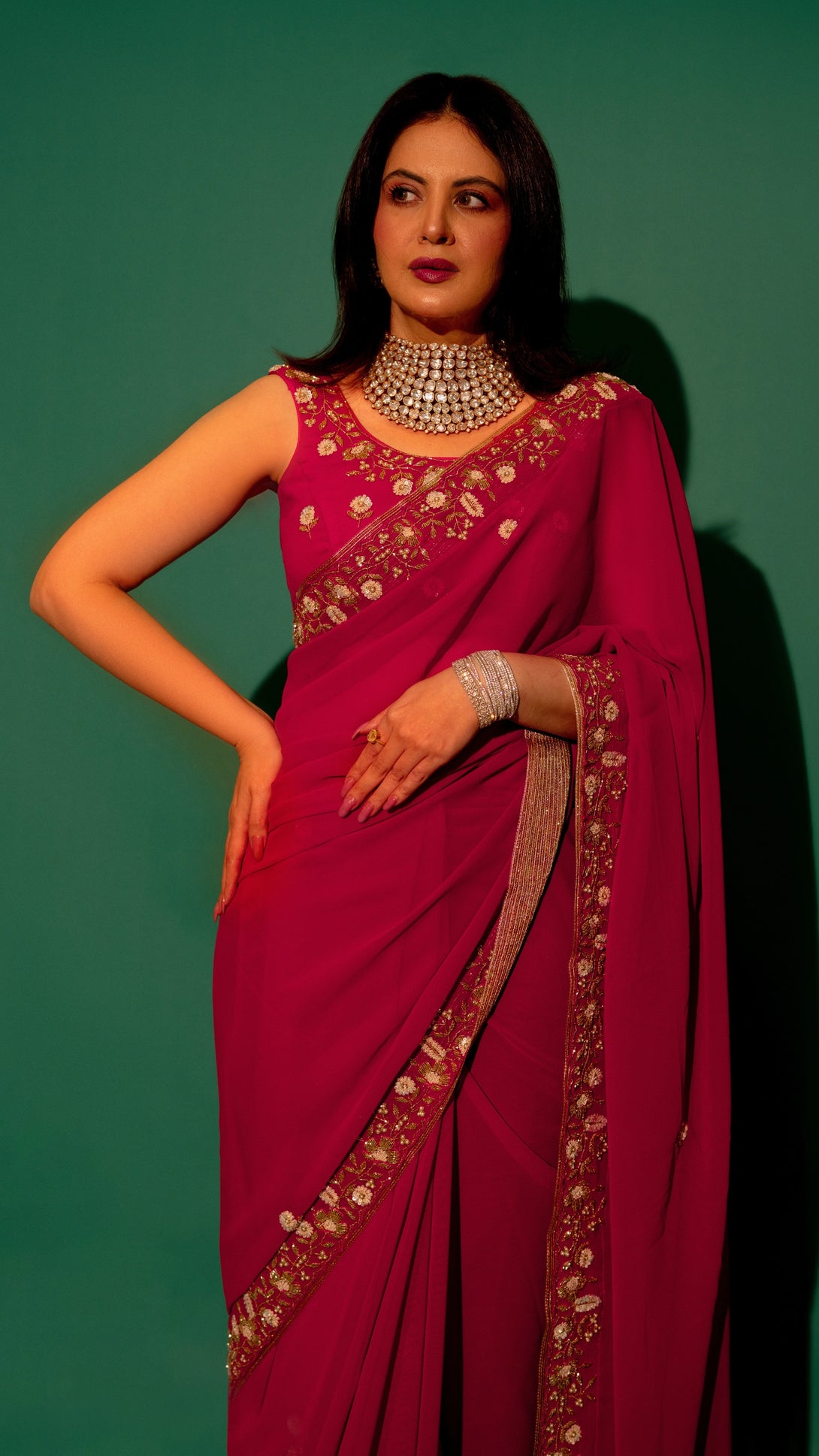 Pink Hand Embroidered Georgette Saree and Matching Floral Embroidered Blouse