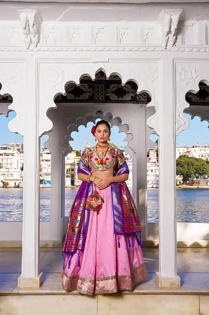 This “Pink Paithani” silk lehenga is adorned with fine zari embroidery and a rich border, paired with a pink printed blouse and a purple dupatta detailed with lotus motifs and playful tassels.