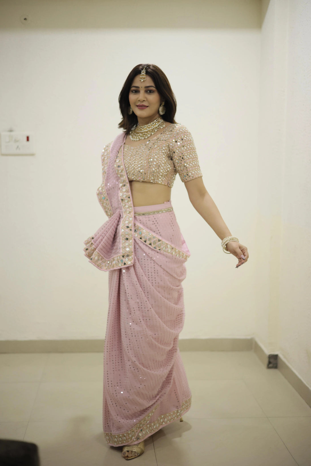 Designed in premium lightweight georgette, it features sequin embroidery, hand-embroidered lace, and authentic mirror work that radiates a delicate shimmer. Paired with a fully embroidered blouse adorned with mirror accents, this saree creates a regal yet contemporary statement look.