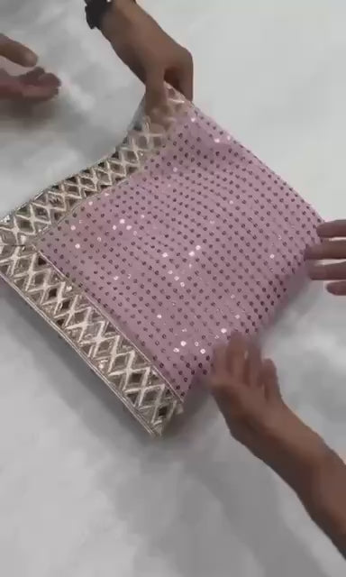 Turn Heads with our “Pink Sequin Georgette Saree with Mirror Embroidery Work and Matching Mirror Sequin Blouse” An ode to timeless elegance, this saree gracefully merges royal aesthetics with modern glam.