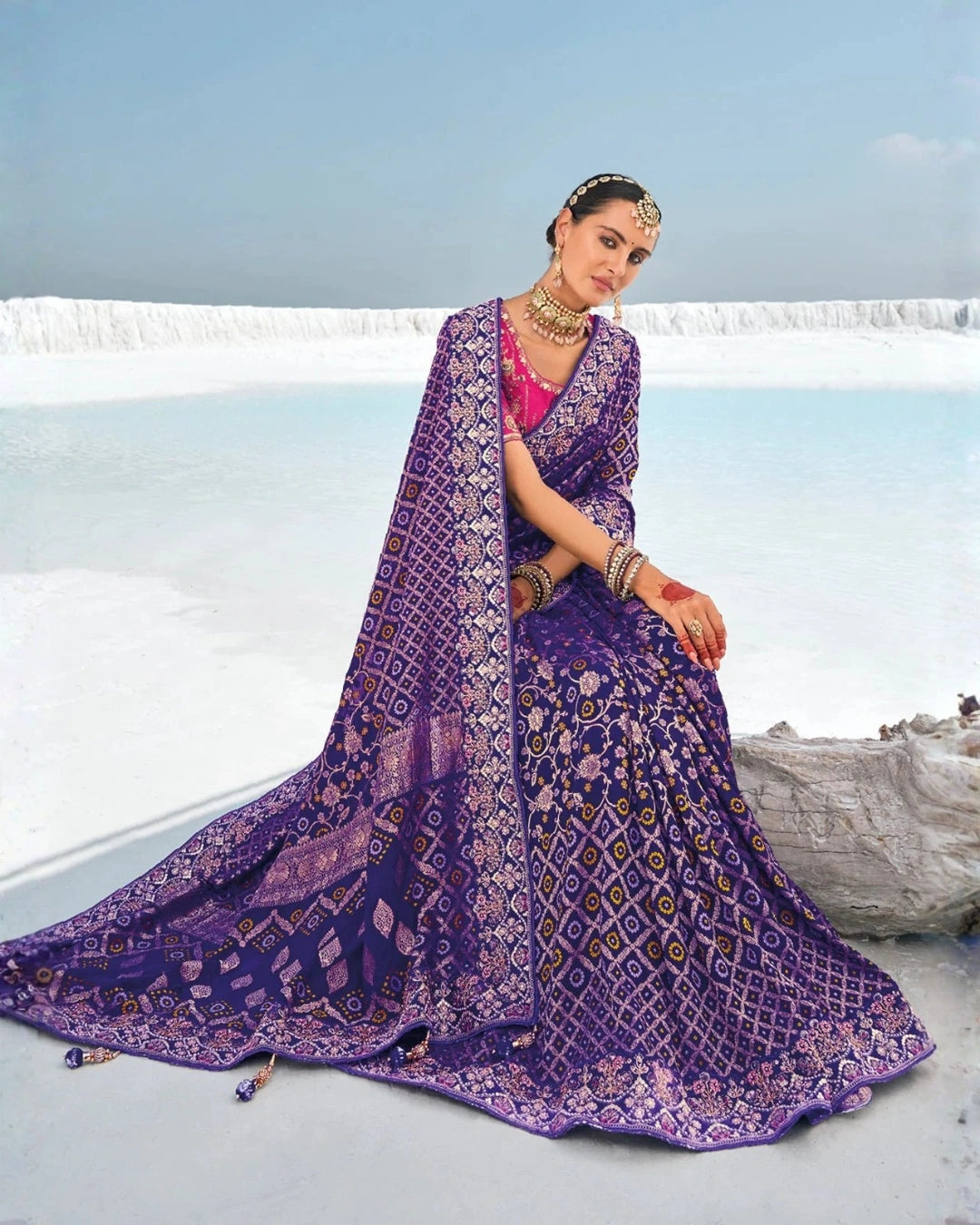 Experience the beauty of Indian tradition with a modern twist. The "Purple Bandhani" Georgette Saree is a graceful blend of heritage craftsmanship and festive elegance.
