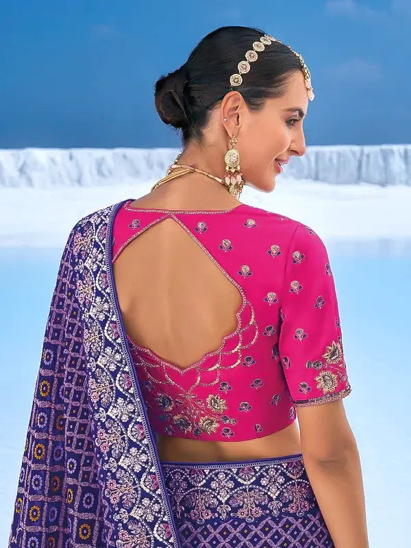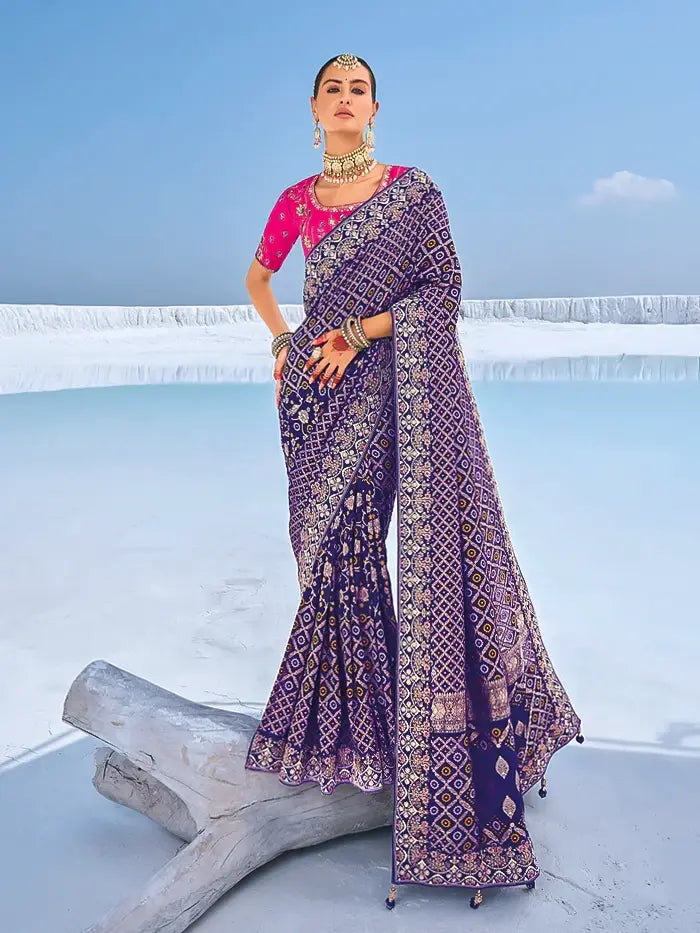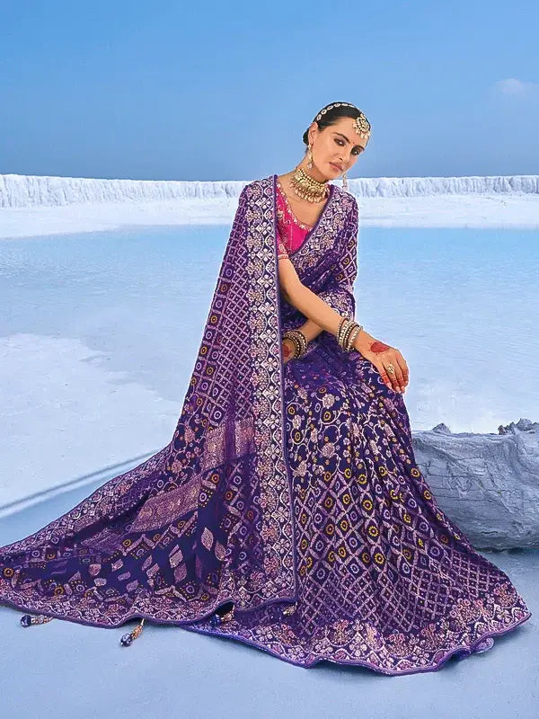 Purple Bandhani Georgette Saree with Intricate Zari Embroidery & Pink Embroidered Blouse