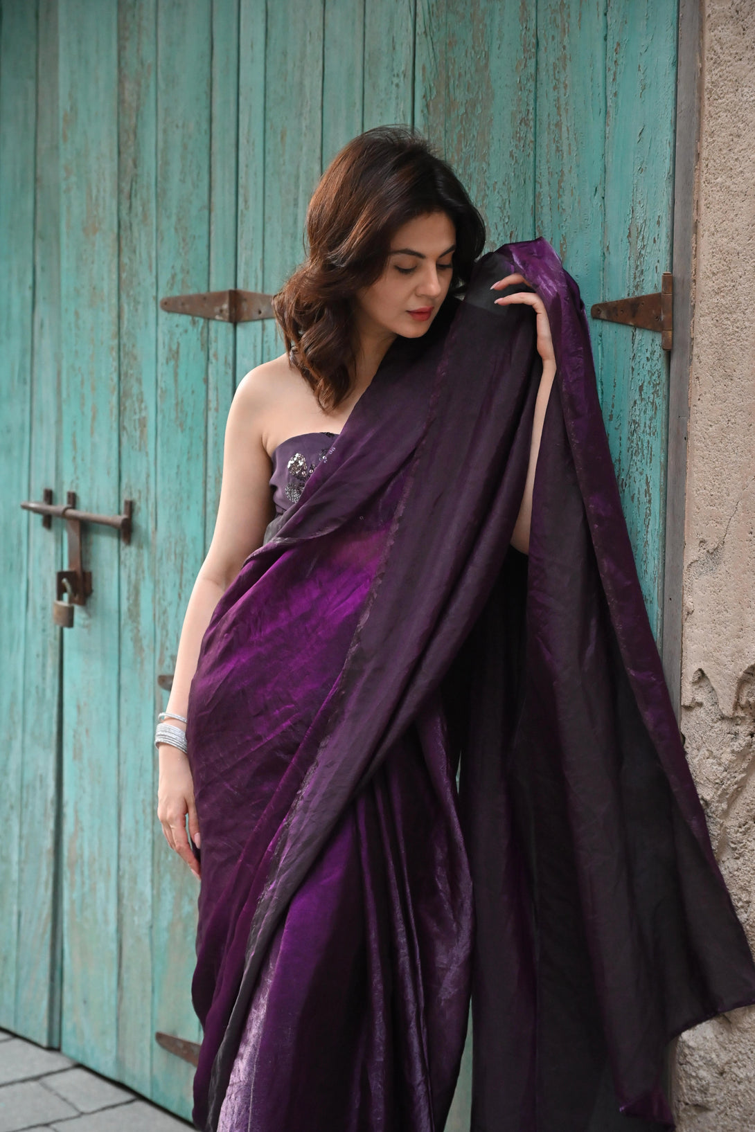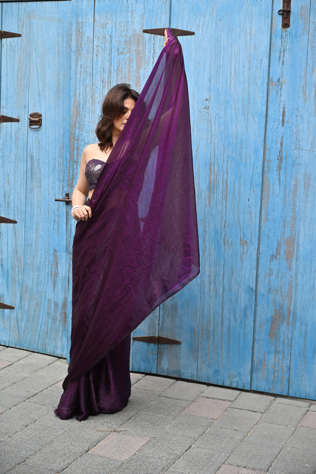 This “Midnight Bloom” saree crafted from premium georgette, the saree flows with a soft, luminous sheen that catches the light in every fold. The deep dark purple hue evokes regal charm, while its fluid drape adds a touch of modern sensuality.