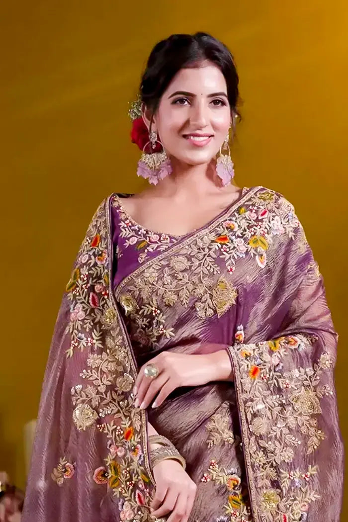 This saree captures the essence of tradition with its rich purple silk base, highlighted by intricate golden embroidery along the borders and pallu. The luminous embroidery glows beautifully against the vibrant silk, making it an ideal choice for weddings and festive celebrations.