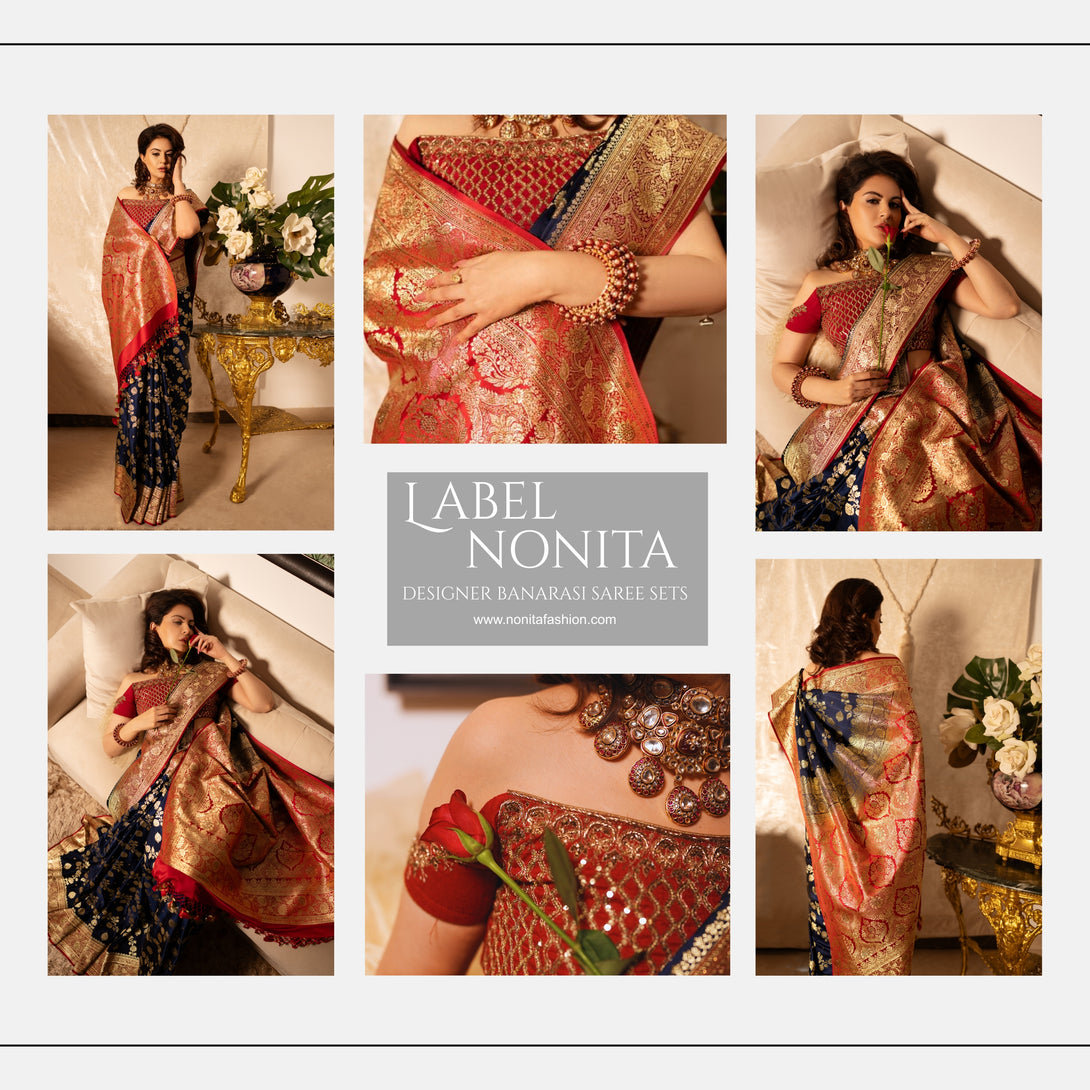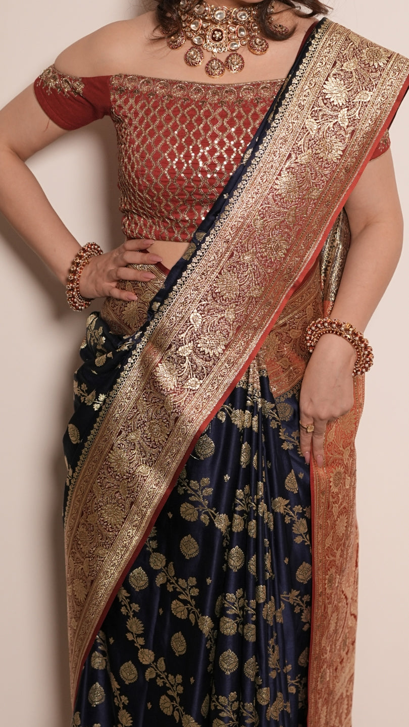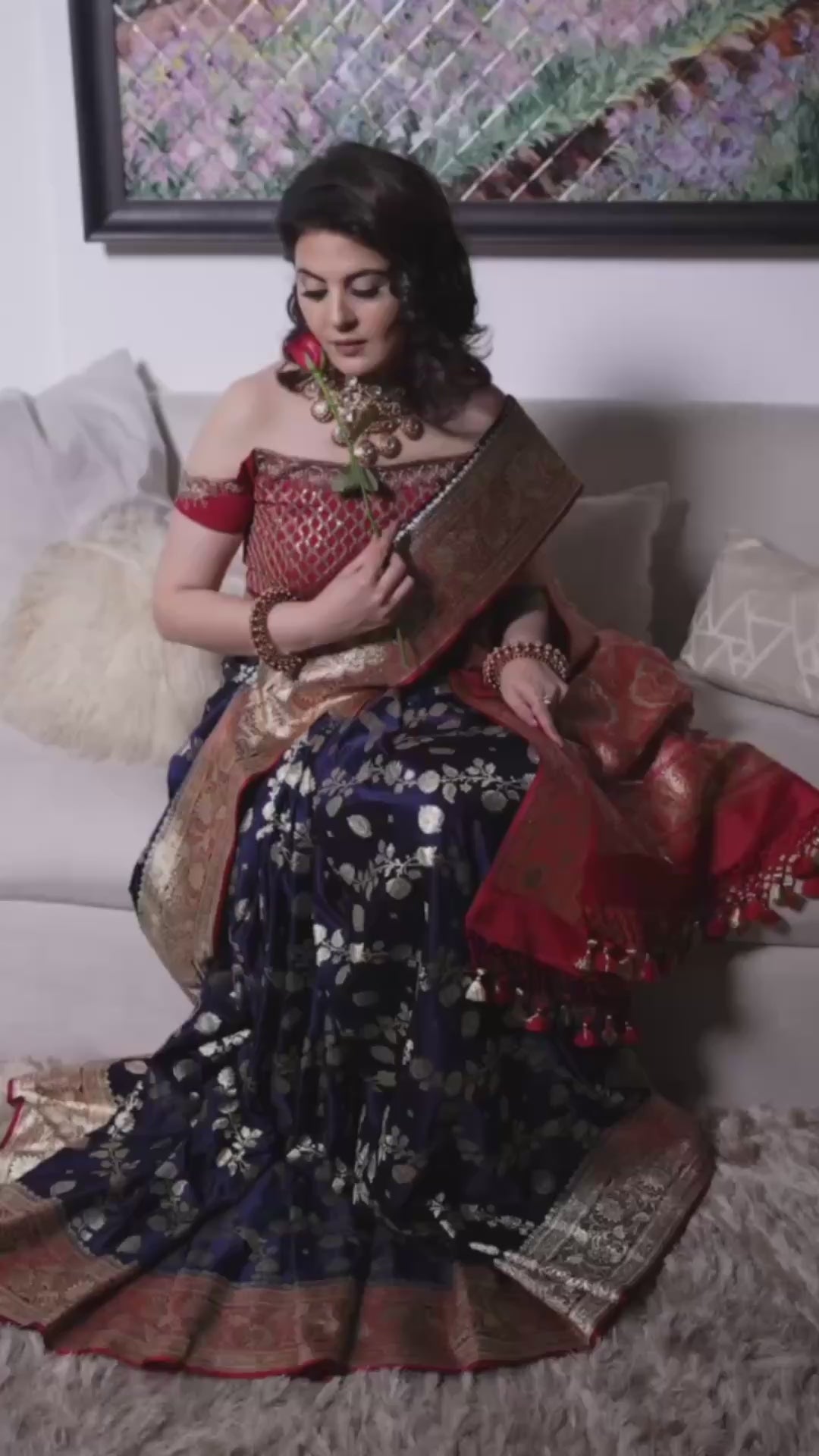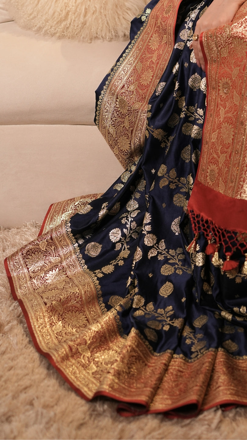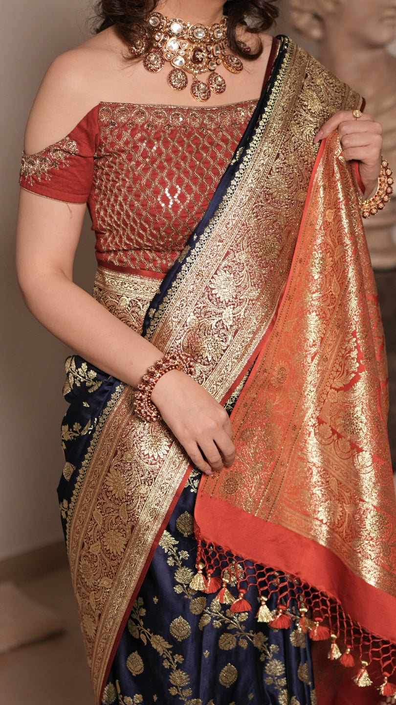This "Varanasi Veil" crafted with deep navy blue base with intricate gold floral motifs, paired with a contrasting red pallu adorned with hand embroidery and rich zari work. Finished with tassel detailing and a matching brocade blouse, this saree is a timeless classic—meant for grand entrances and whispered compliments.