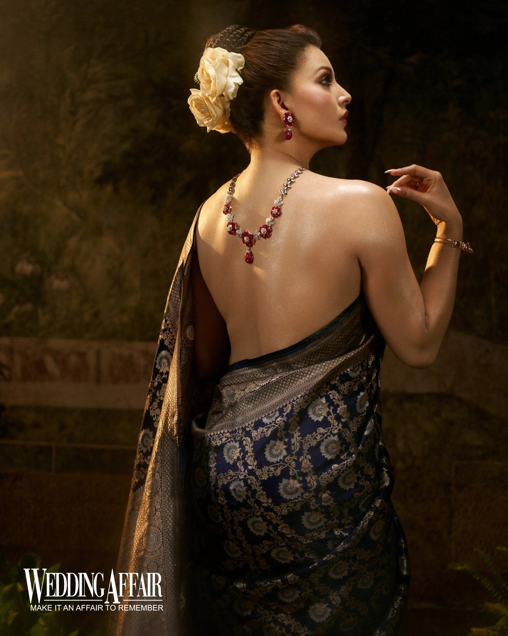 Step into timeless elegance with our "Ananda Metallic" Pure Banarasi Silk Saree, handcrafted in the heart of Banaras and adorned with our signature floral motif. This saree is a regal addition to any wedding trousseau or festive wardrobe.