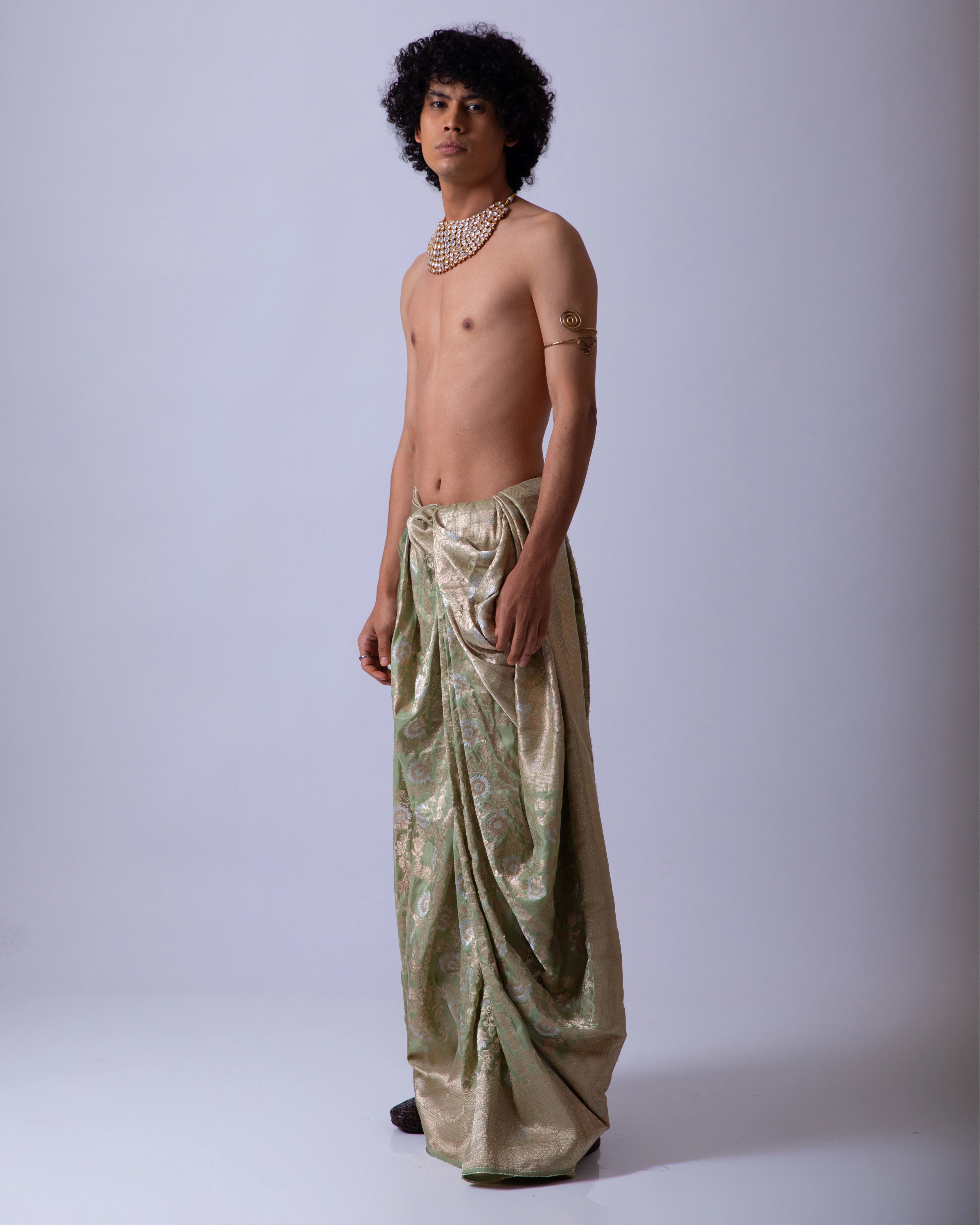 Dhoti crafted from luxurious woven silk, finished in a muted sage green hue that exudes understated elegance. The fabric features delicate gold woven motifs. Designed to drape effortlessly.
