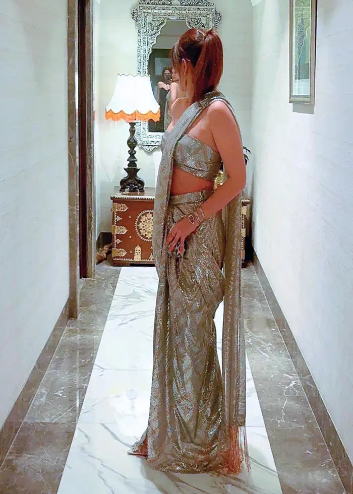 Silver Gold Georgette Saree with Pre-Draped Sequin Work and Matching Sequin Blouse is where modern ease meets dazzling elegance. Its pre-stitched silhouette and sequin sparkle offer instant glamour.