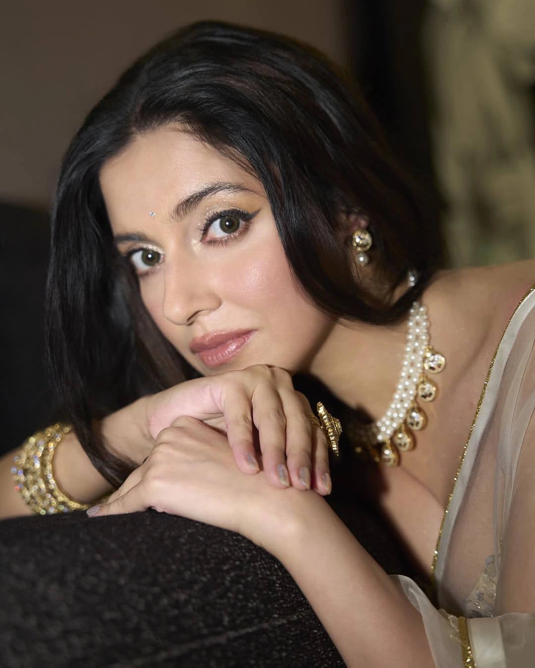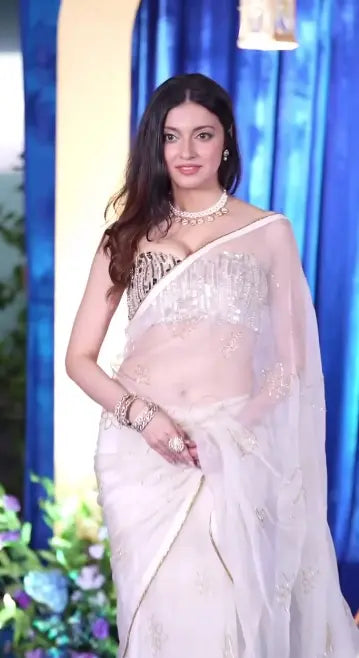 This “Ethereal Whisper” crafted from pure silk organza, the saree is delicately hand-embroidered with gold thread and intricate motifs that shimmer softly with every movement. The sheer, airy texture drapes beautifully, creating an aura of effortless sophistication.