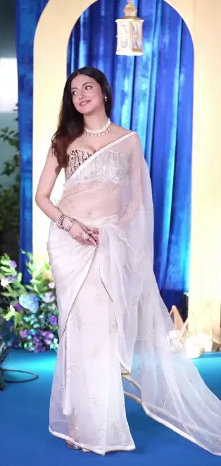 White Pure Silk Organza Saree with Hand Embroidery & Custom Strapless Blouse