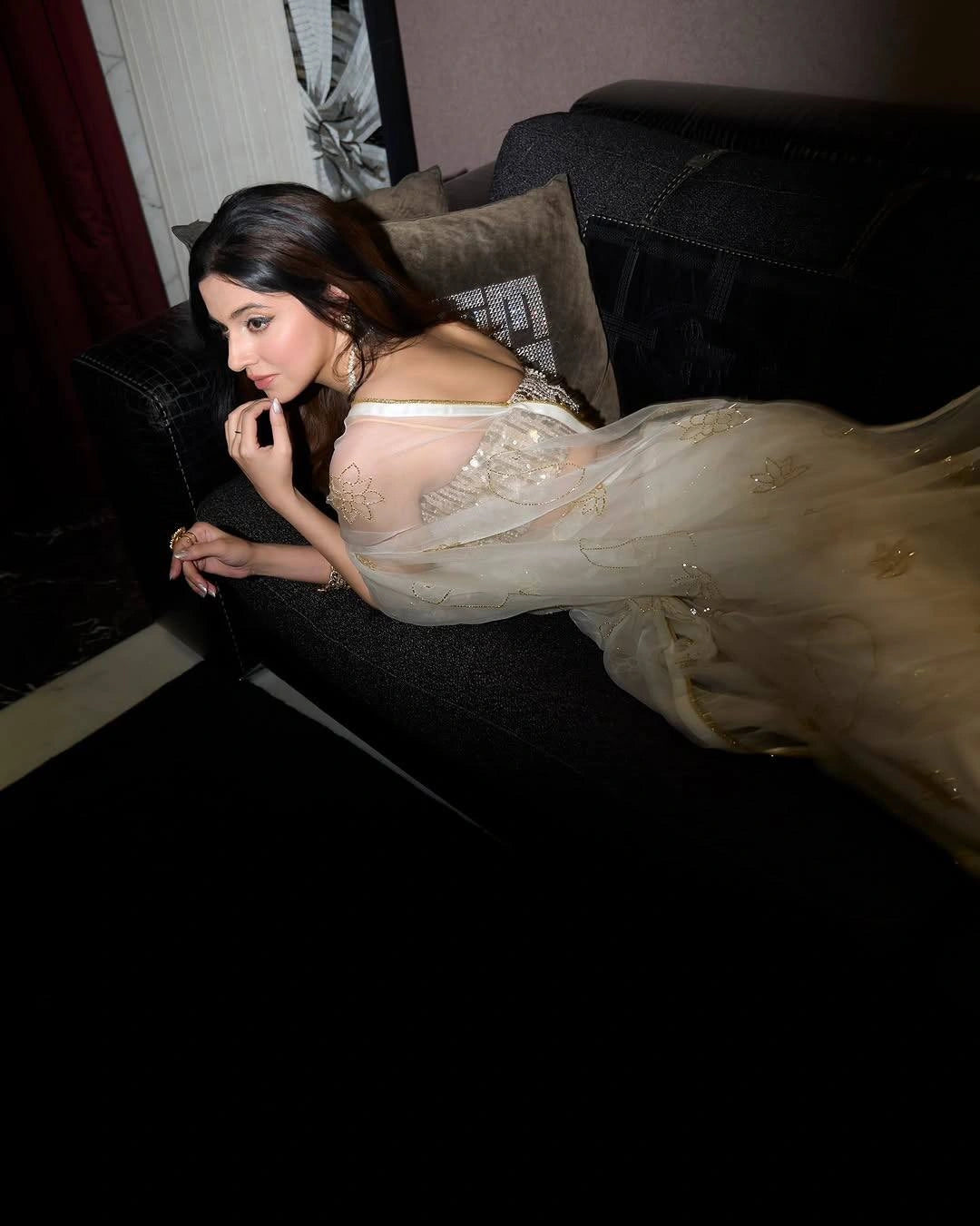 Paired with a customized cream strapless blouse featuring hand-embroidered sequins, salli work, and delicate embellishments, the back wrap design adds a touch of modern sensuality to this classic silhouette.