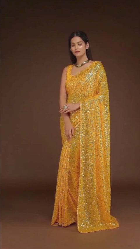Yellow Georgette Saree with All Over Shimmer Sequin Work and Matching Sequin Blouse