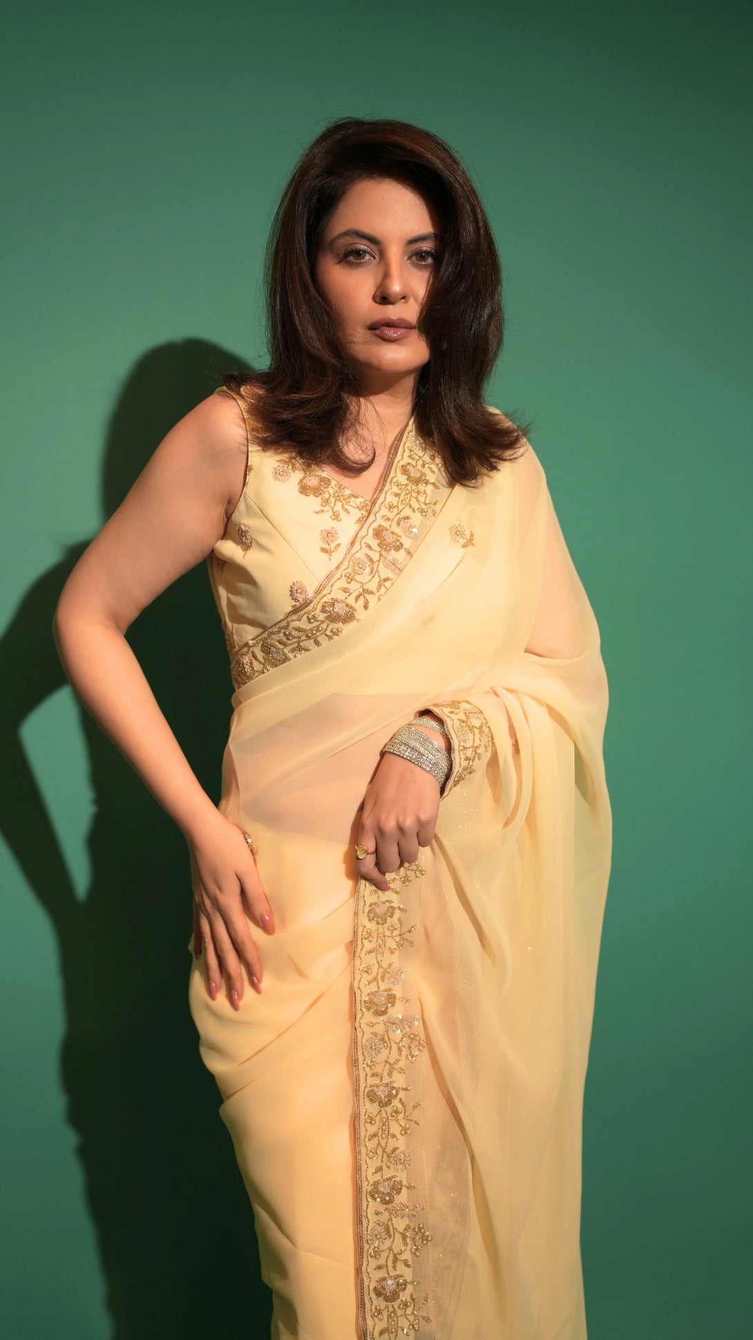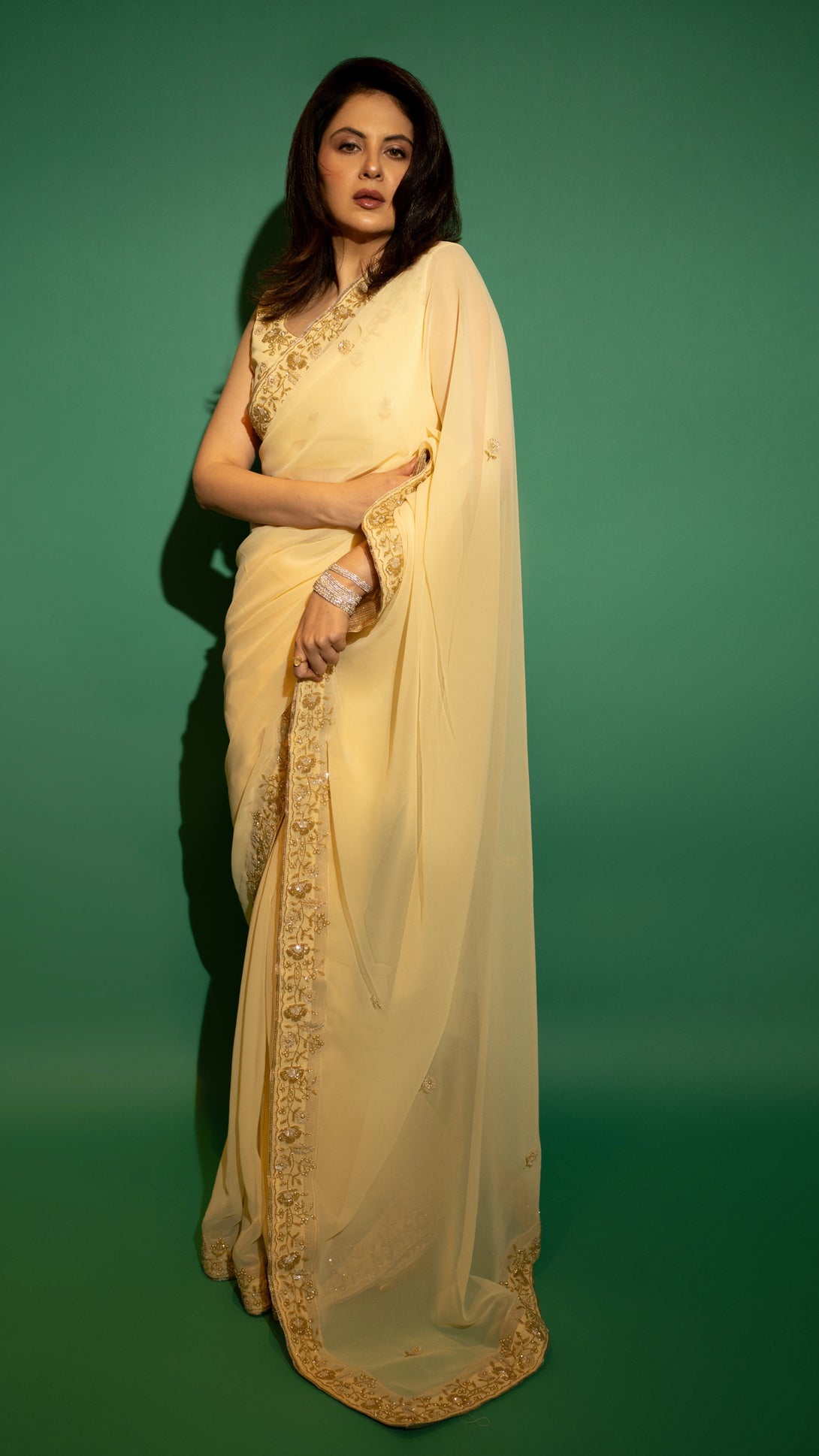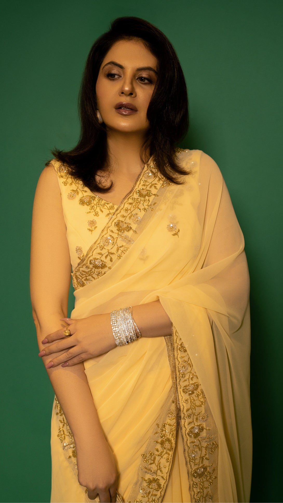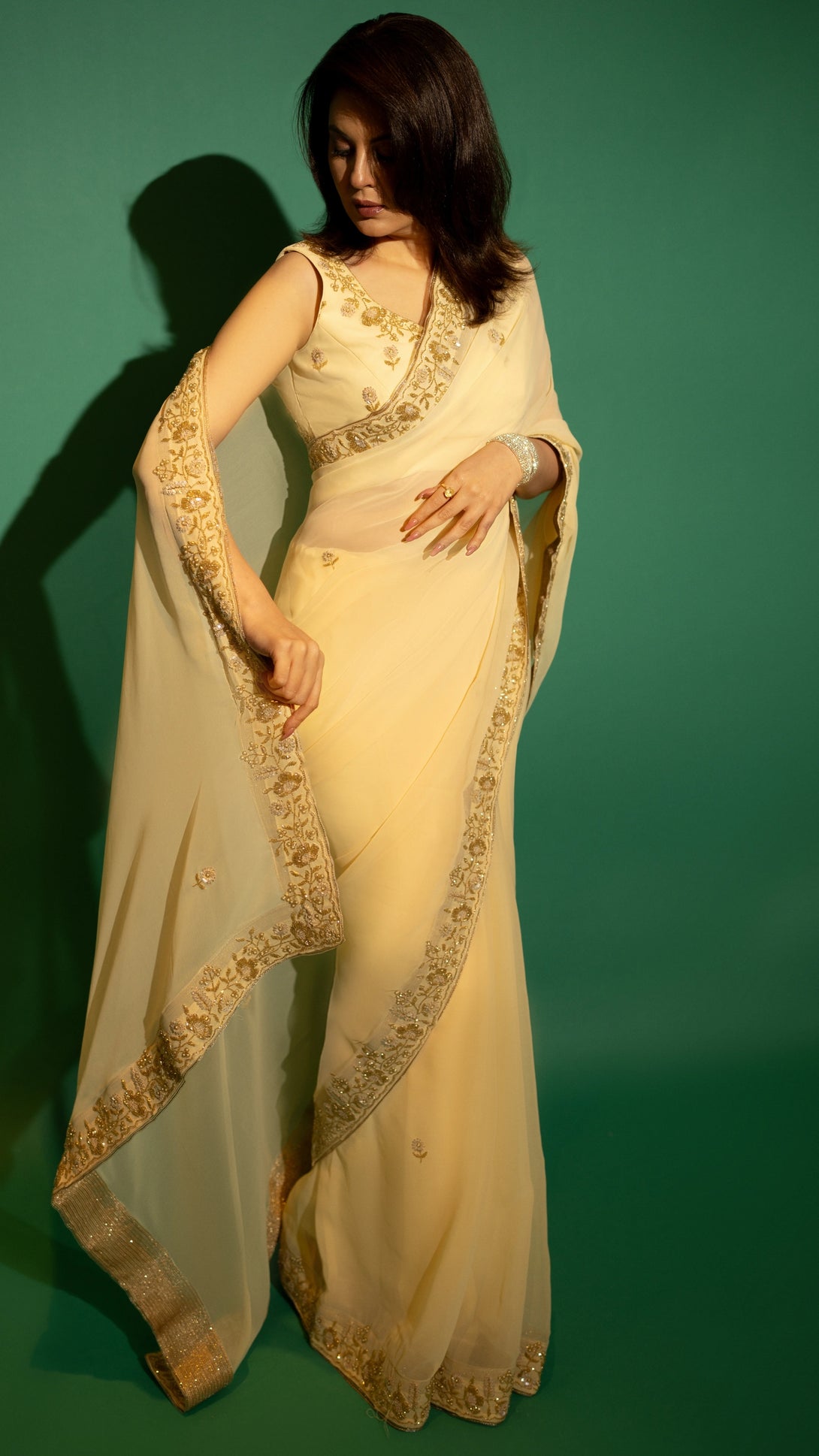 Yellow Hand Embroidered Georgette Saree and Matching Floral Embroidered Blouse