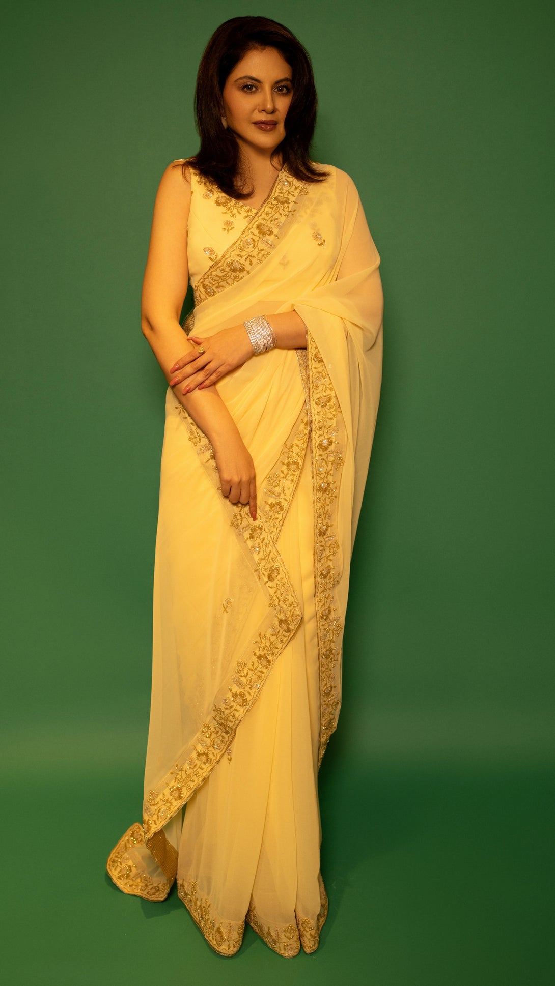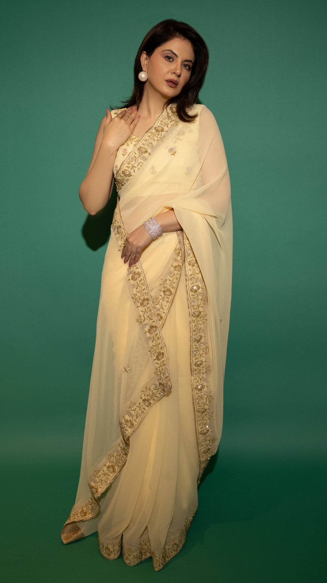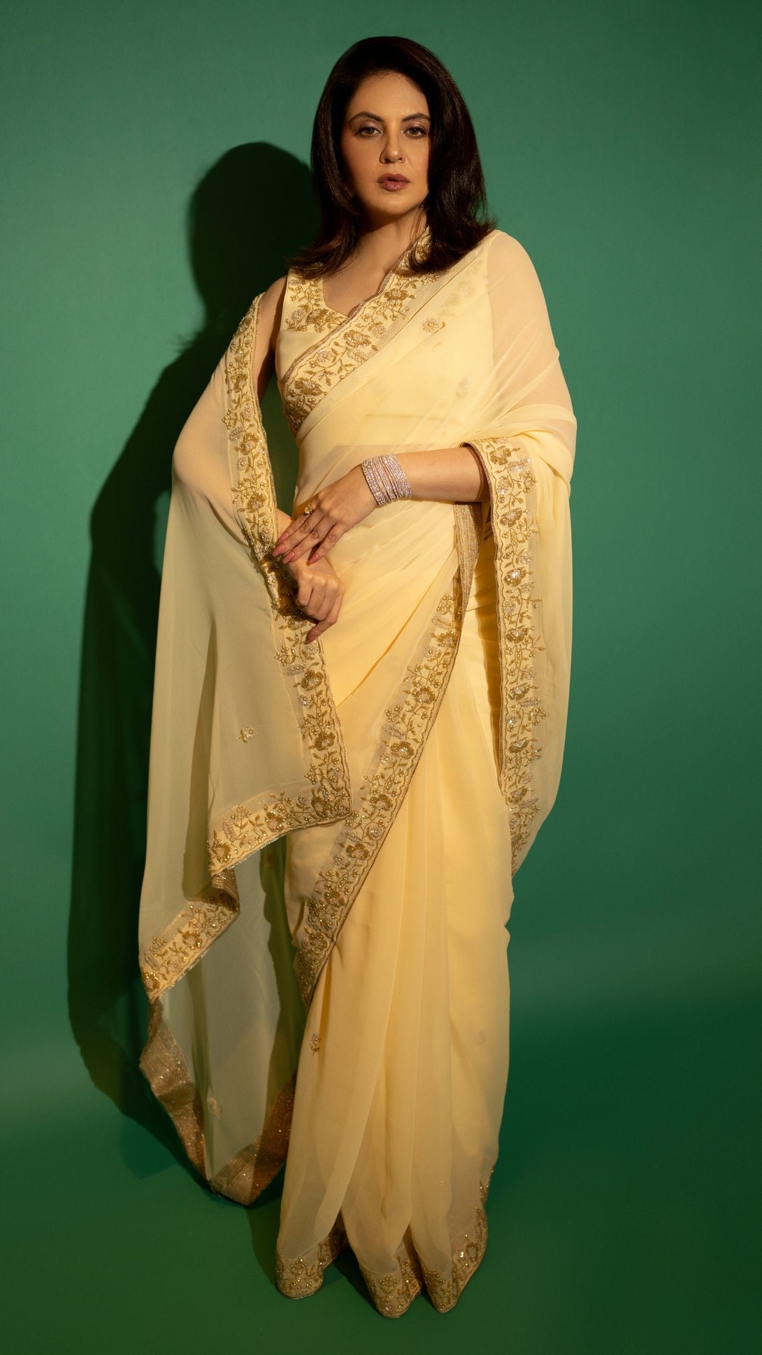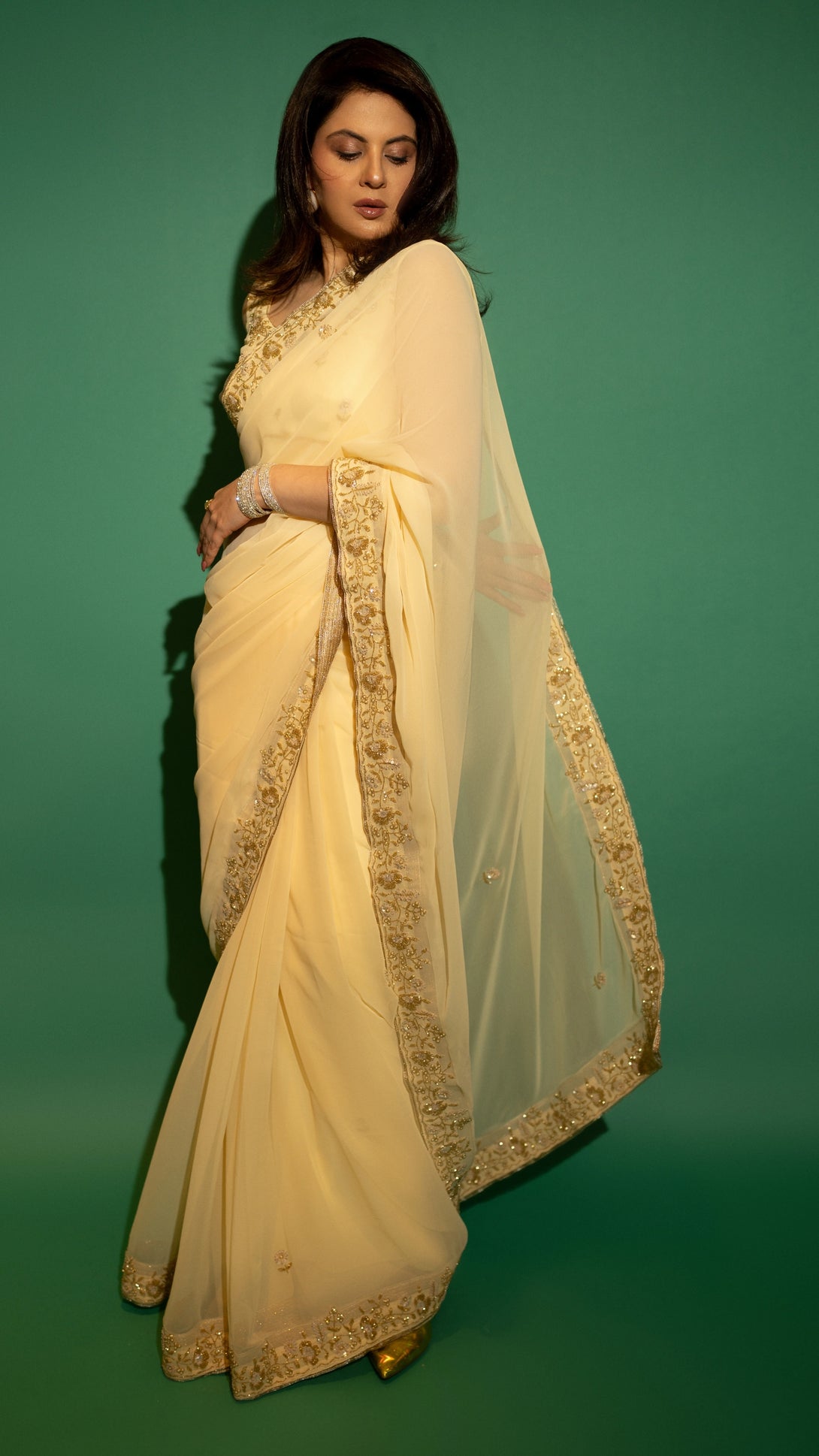 Yellow Hand Embroidered Georgette Saree and Matching Floral Embroidered Blouse