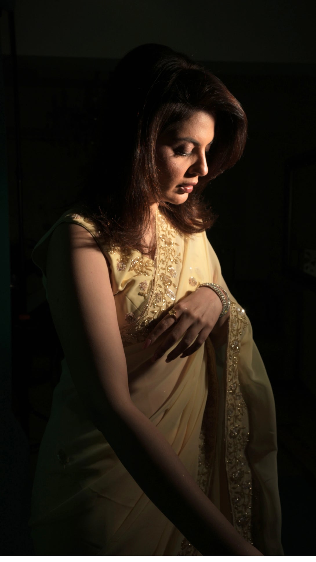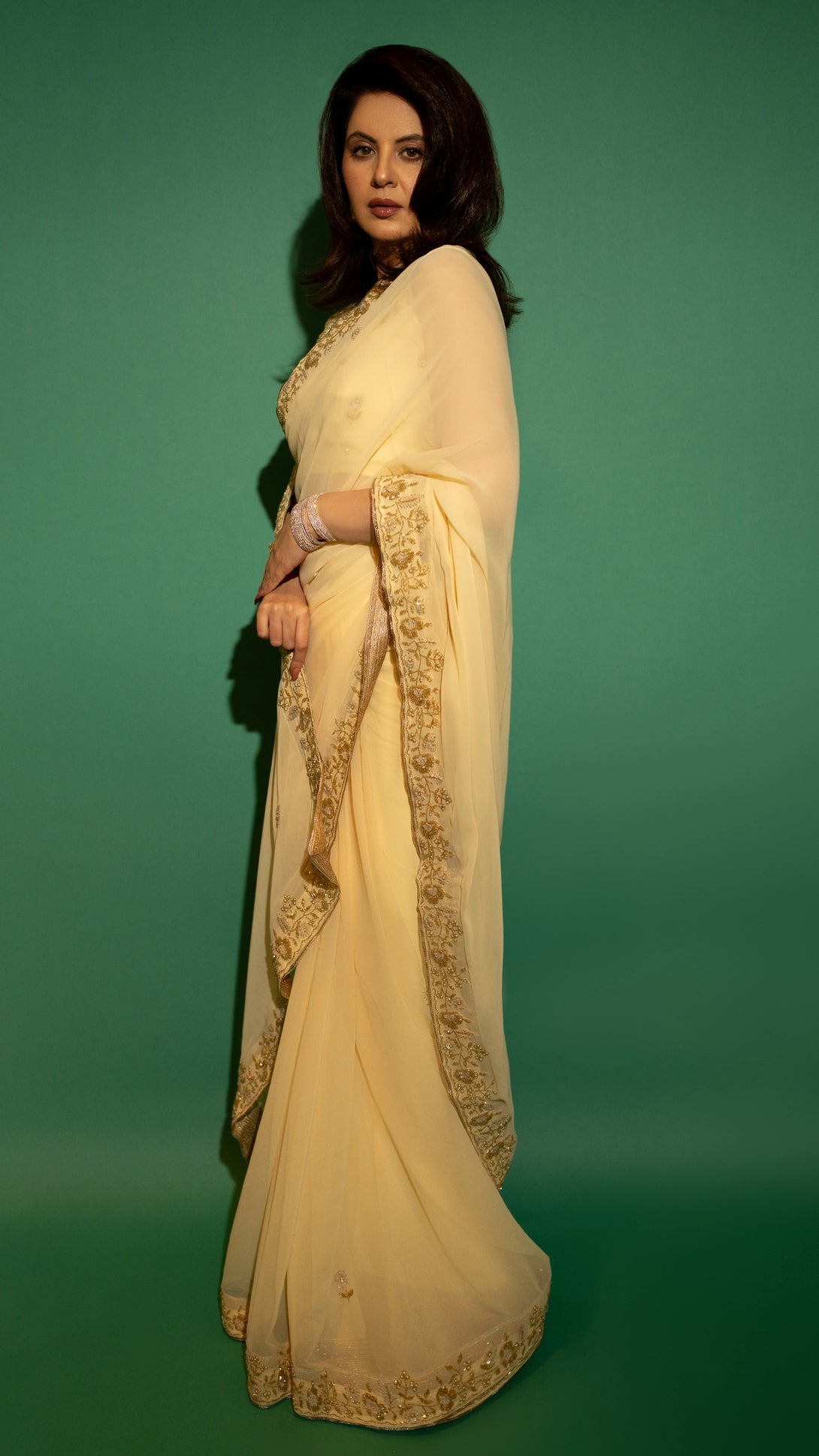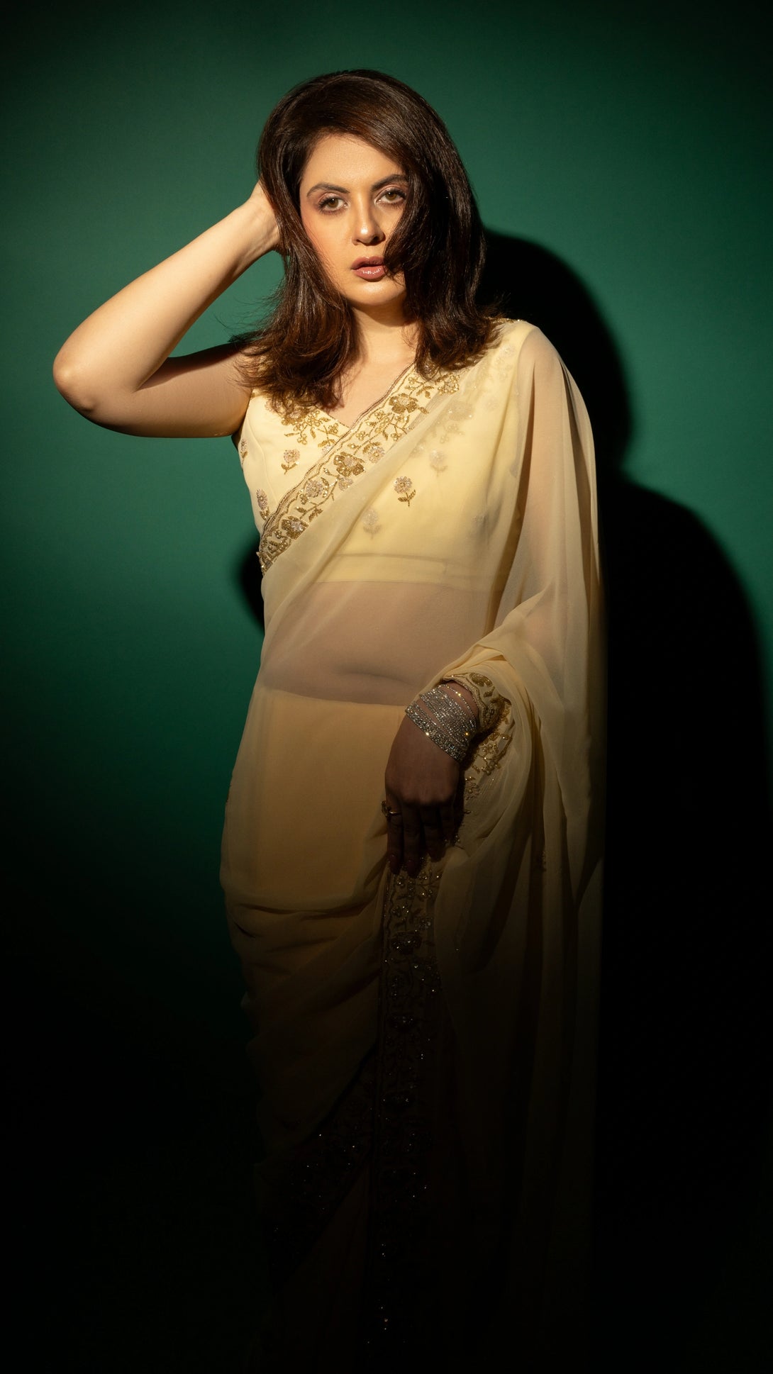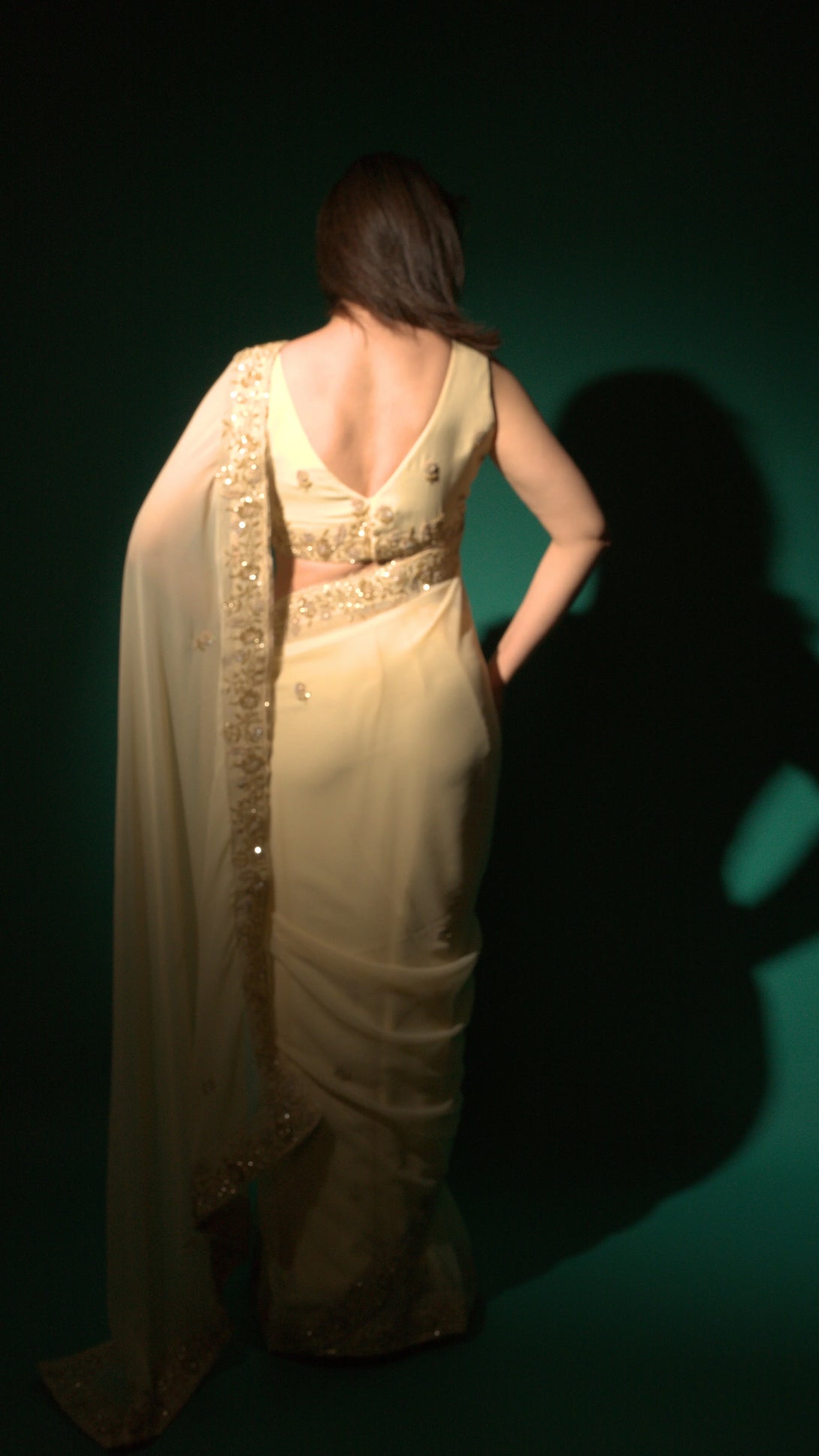 This "Fleur-de-Lis Saree" is Crafted from premium lightweight georgette. The Sadi handwork combined with delicate floral thread embroidery and sequins detailing adds depth and brilliance to every drape. Beautifully finished with a refined champagne border on the inside.
