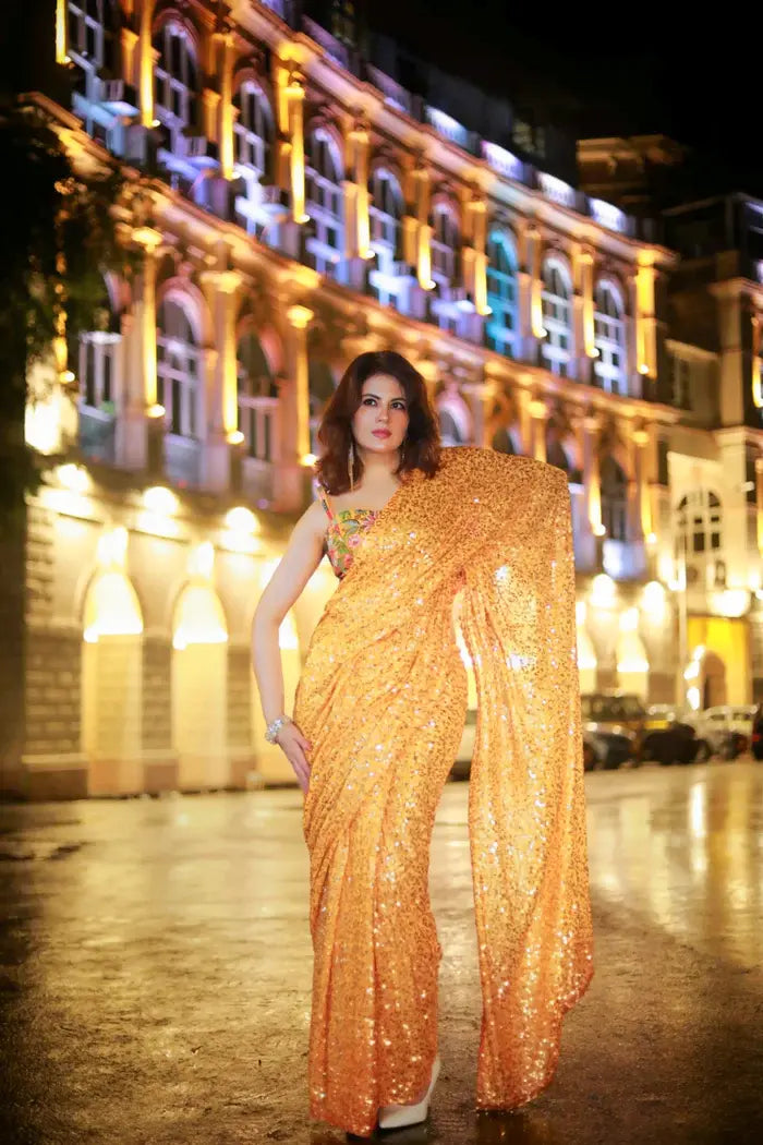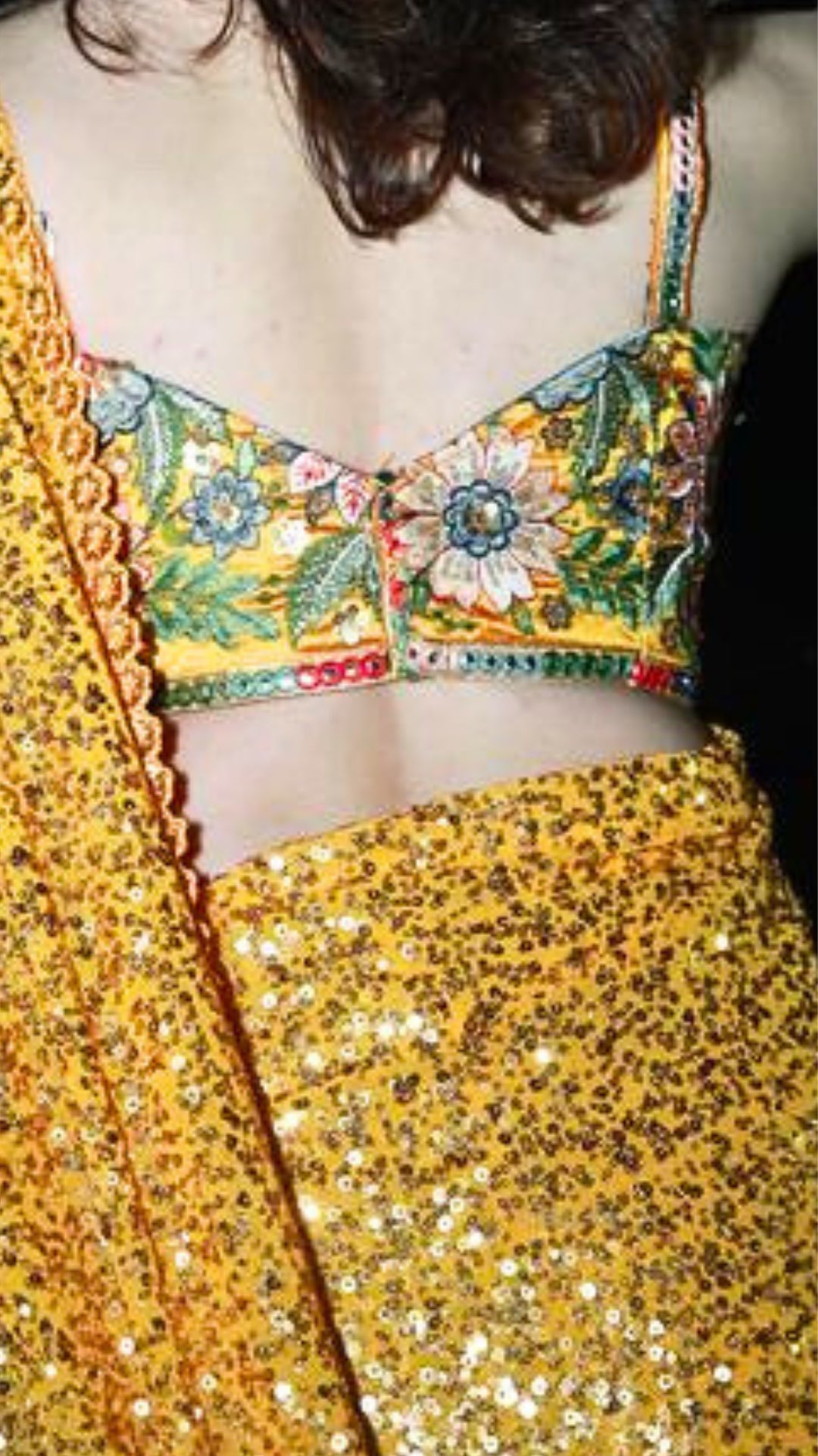 Crafted in lightweight premium georgette with all-over sequin embroidery. It’s paired with a multicolored sleeveless blouse, adorned with floral threadwork, mirror detailing, and neckline and back strap customized by Label Nonita .